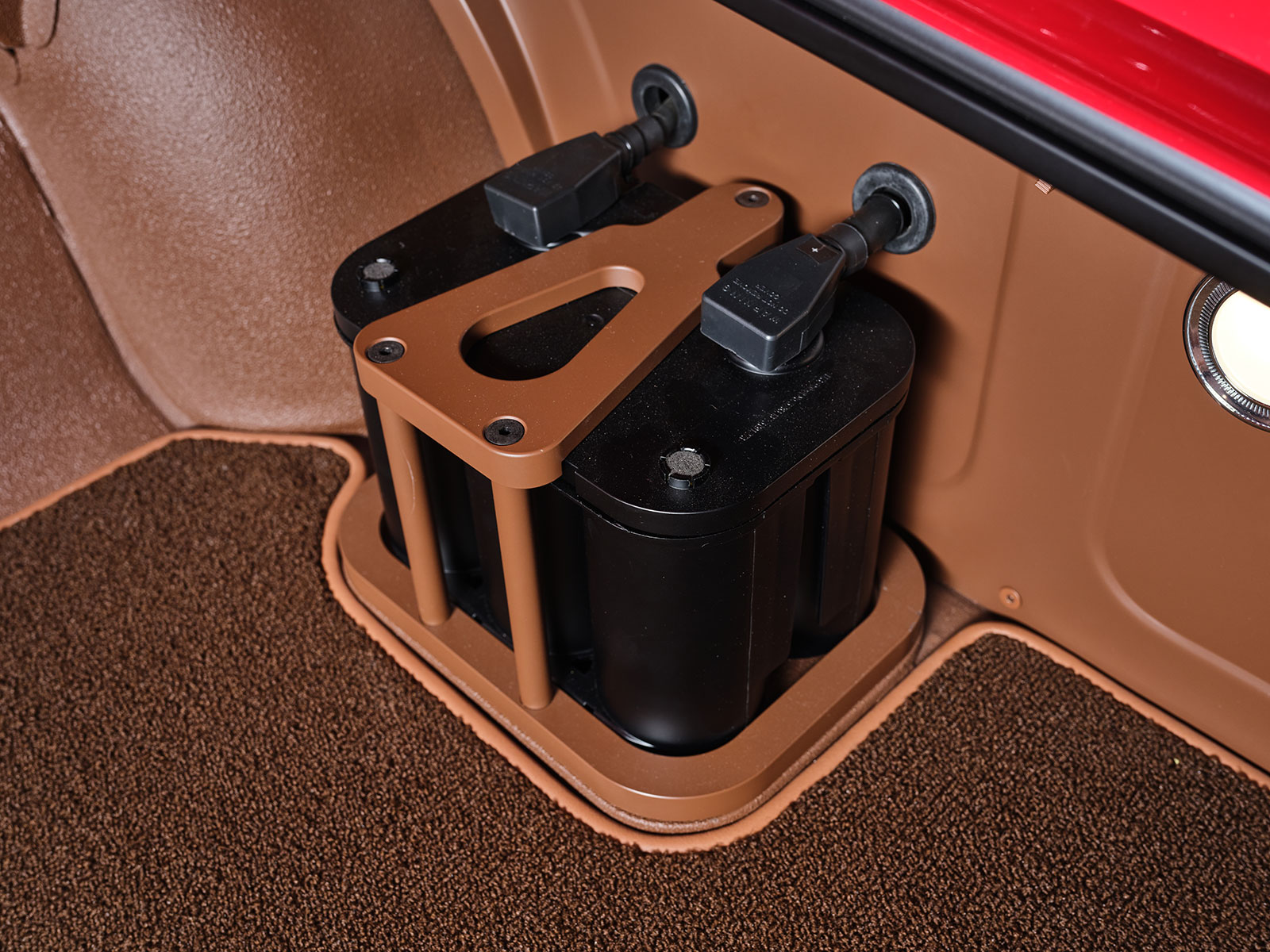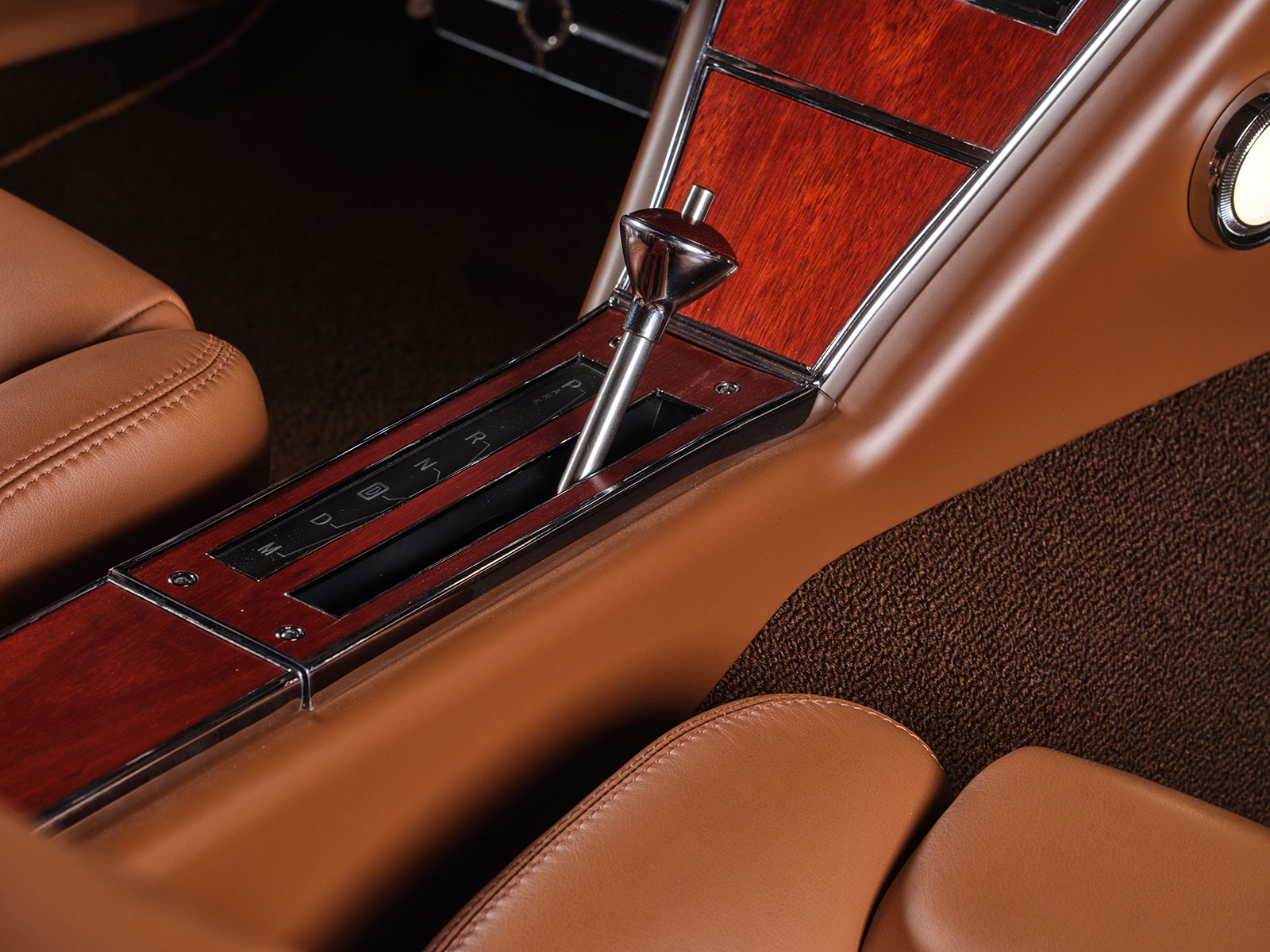 For the interior, let’s begin with the modified factory dashboard. The Buick Riviera has always been known for its impressive dash and center console and while it retains its distinctive look there are some noteworthy alterations. The dramatic instrumentation comes by way of Classic Instruments with its single left-mounted circular 160-mph speedo, a center-mounted small-diameter circular tach, and single right-mounted circular gauge with its center-mounted clock and the obligatory fuel, temp, volt, and oil instruments surrounding the timepiece. Getting all the wiring to handle the chores, which includes the Classic Instruments gauges and Vintage Air Gen IV AC System with upgraded dash controls, is the handiwork of Eads whose skills were seen on the American Autowire custom-built wiring system. Also, highly visible and eye appealing is the custom-machined two-spoke wooden wheel, with paddle shifters and machined in-house, that rests on top of the tilt ididit steering column. We have mentioned that the Riviera is also known as a luxury car and in keeping with that obligation is a pair of front Recaro bucket seats plus a pair of custom bucket seats in the rear with a center displayed “waterfall.” The tan leather is used to cover all the seating, panels, and so on, by Phil Cato of Cato’s Custom Upholstery of Salt Lake City. He also stitched up the headliner, which is made from Cattle Tan Suede as well as the dark brown carpeting. Note the trunk is equally as detailed and now acts as a home for the relocated Optima battery that’s mounted within a Detroit Speed relocation battery tray.