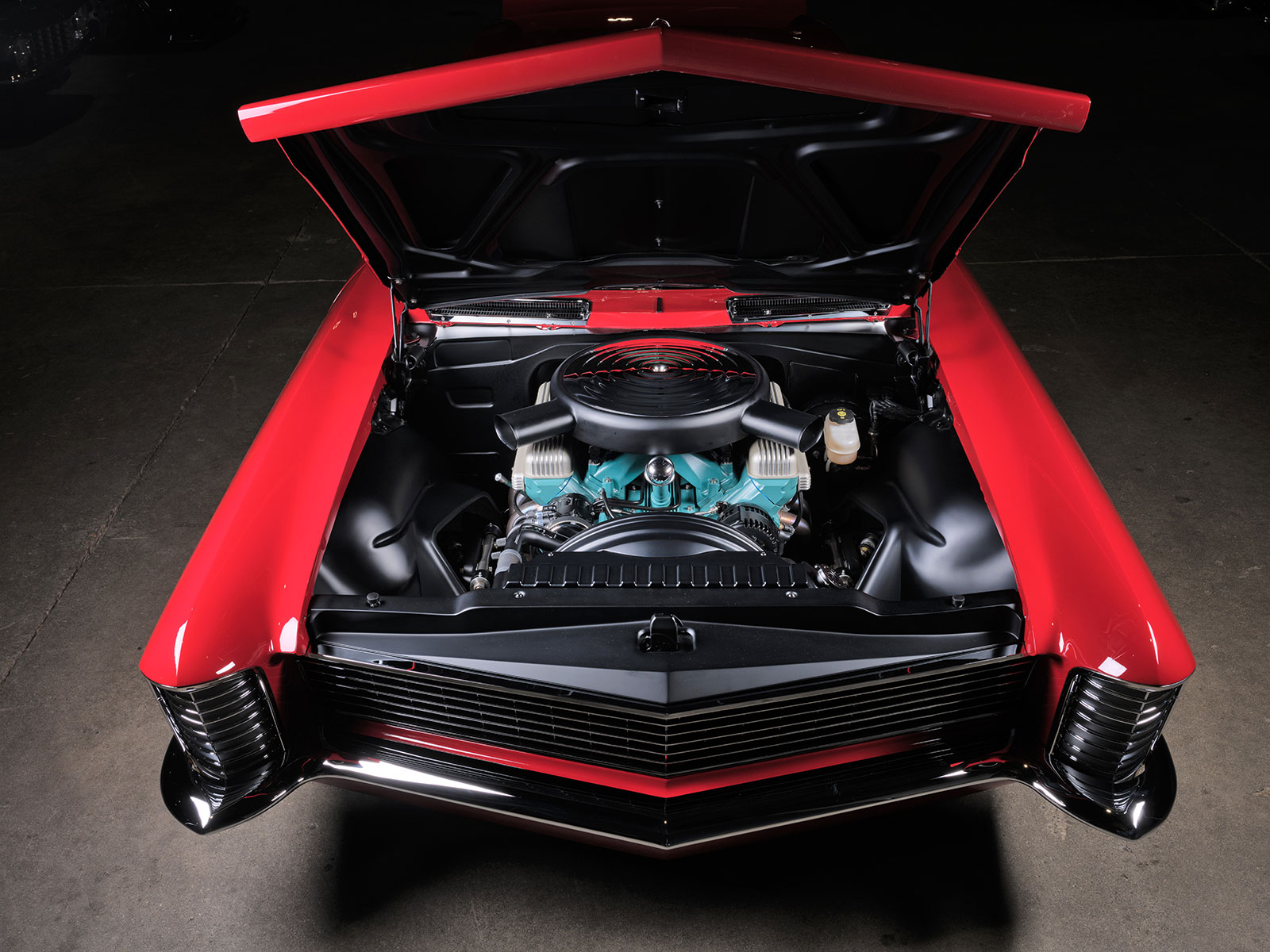 The sheet metal retains the looks we have come to love on the 1965 Buick Riviera while undergoing a few tasteful modifications that “work.” What has become mandatory on any ’60s hot rod build—the bumpers, front and rear, were removed and reworked. In this case our ’65 had both its bumpers built from scratch while the rear roll pan was reshaped, rocker areas reworked, allowing for the peak-though exhaust and the lower quarter-panels to be reshaped. The Buick Riviera was debadged and the drip rails shaved. Interestingly the glass, while stock, was remounted but this time as a flush fit. The lighting, headlights, and taillights were custom machined, showing off the new front “clamshells” and the freshly minted tail light housings, lenses, and trim. The new front turn signals were crafted by a 3D printer while the exhaust features custom rings; a Detroit Speed hood ornament is now visible.