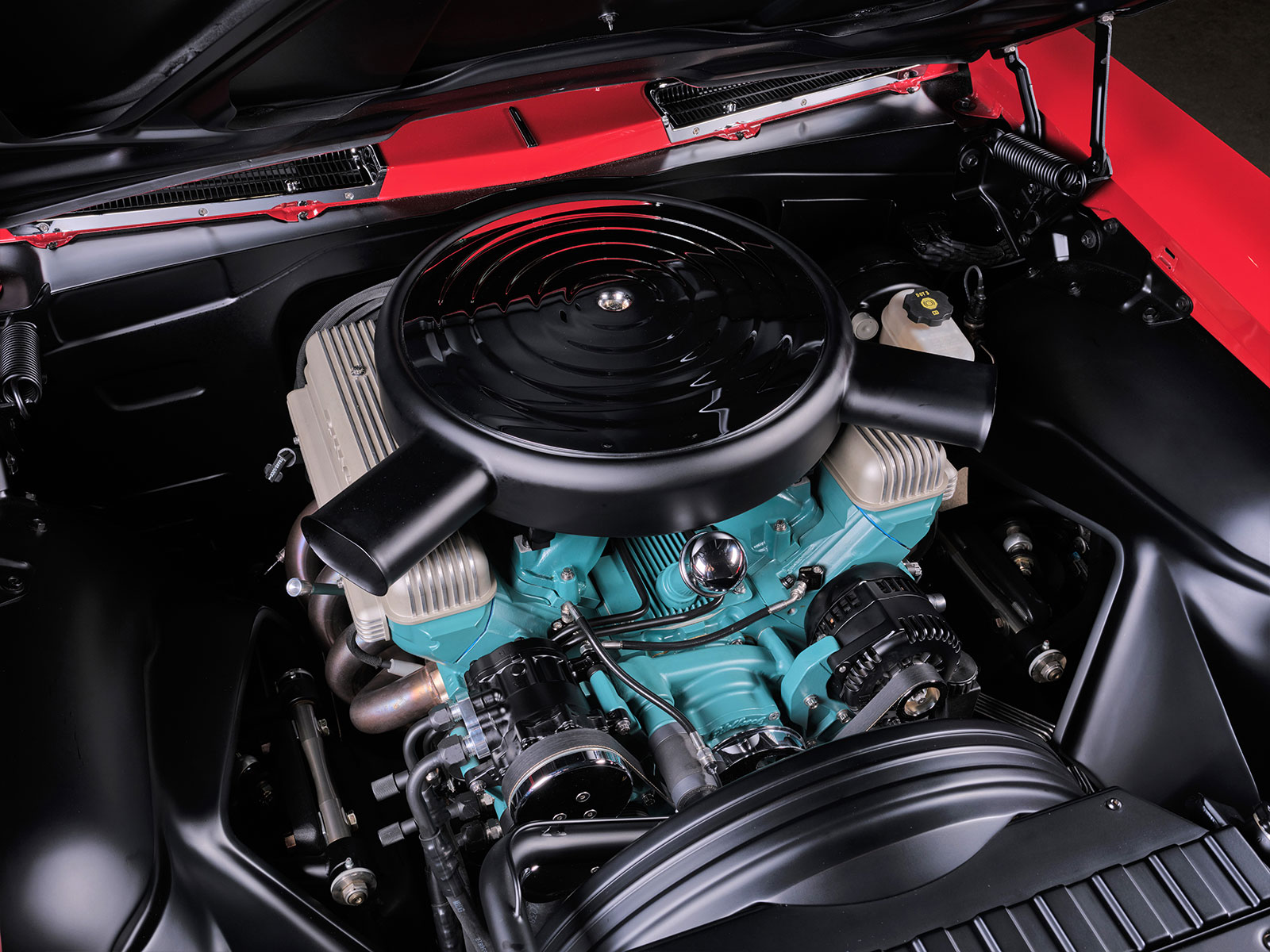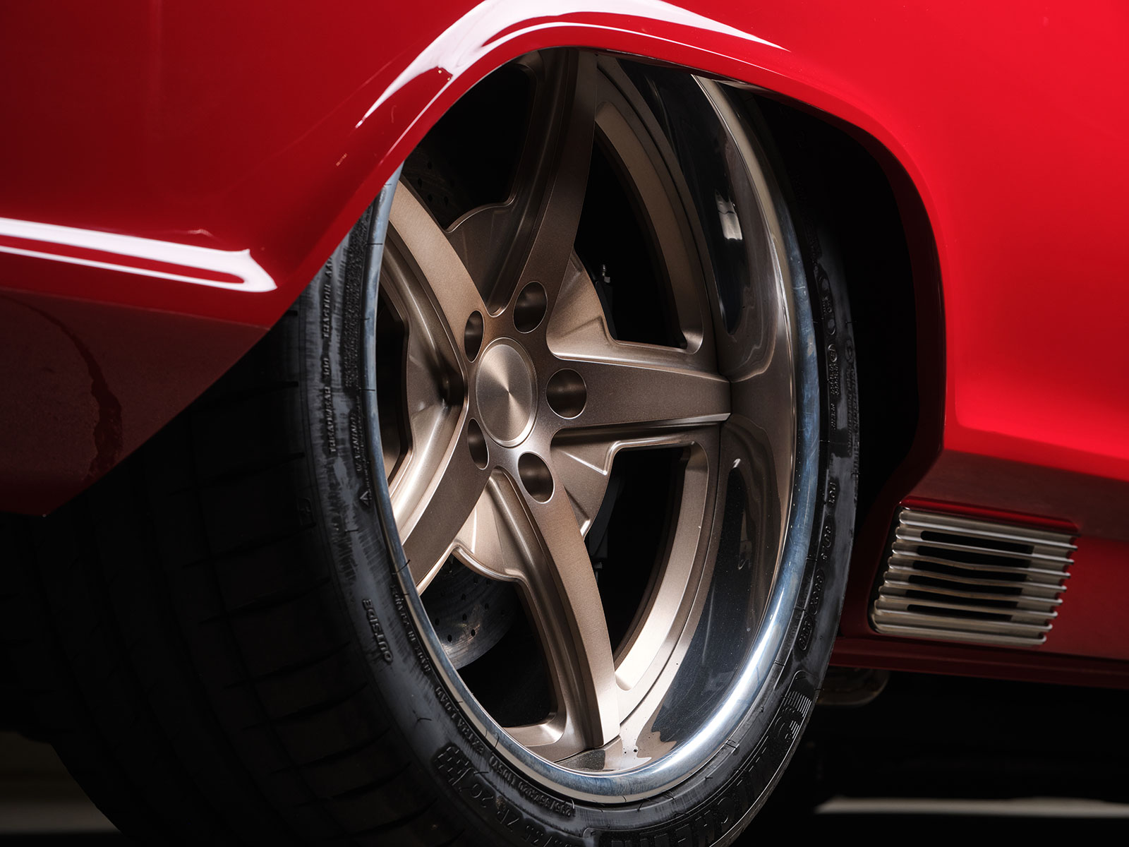 The frame is based on a set of custom ’rails with a Detroit Speed hydroformed subframe with custom three-link using Detroit Speed Swivel-Link technology in back. The front is based on a Detroit Speed SLA with Detroit Speed drop spindles, a 1-1/4-inch front sway bar, double-adjustable JRi coilovers, and Detroit Speed rack-and-pinion steering. In the back a GearFX rear end is used based on a Ford 9 inch rear end with US Gear 3.50 ring-and-pinion and Moser axles. Bringing all this hot rod to a halt is a front/rear combination of Corvette ZR1 with Z06 package carbon-ceramic rotors and calipers plus a JRi ride height system and Bosch ABS. The wheel-and-tire combination is made up of Roadster Forgeline wheels measuring 19×8.5 and 20×10 then wrapped with Michelin Pilot Sport high-performance tires coming in at 265/35R19 and 295/35R20.