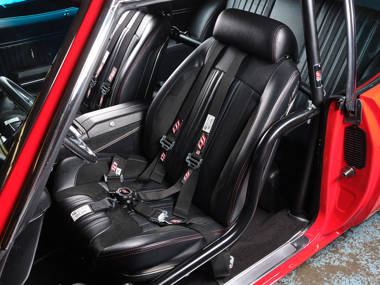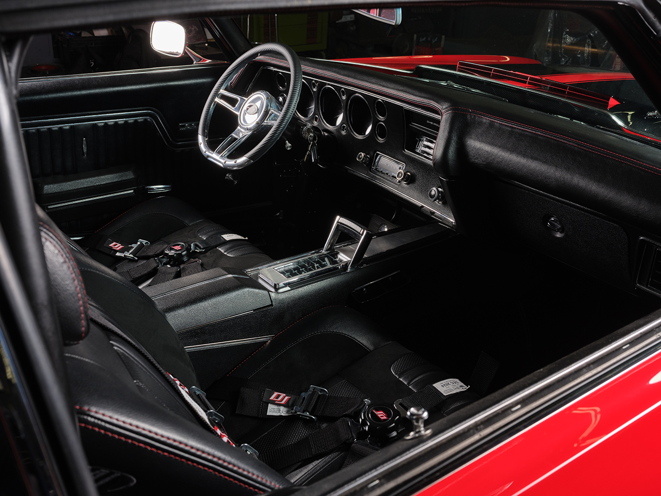 The business center combines a factory feel with modern touches for a high-performance environment. TMI suede and Ultraleather upholstery, installed by the gang at Vos Upholstery, provides a fresh take on the classic-style interior. The stock dash houses updated Dakota Digital gauges to monitor the car’s vitals, while a Billet Specialties steering wheel perched on the Ididit steering column adds some additional flair. U.S. 12 Speed installed a 10-point chromoly rollcage for safety, with additional chassis stiffness as a by-product of the exercise. Black DJ Racing harnesses complement the TMI leather bucket seats, blending safety with comfort.