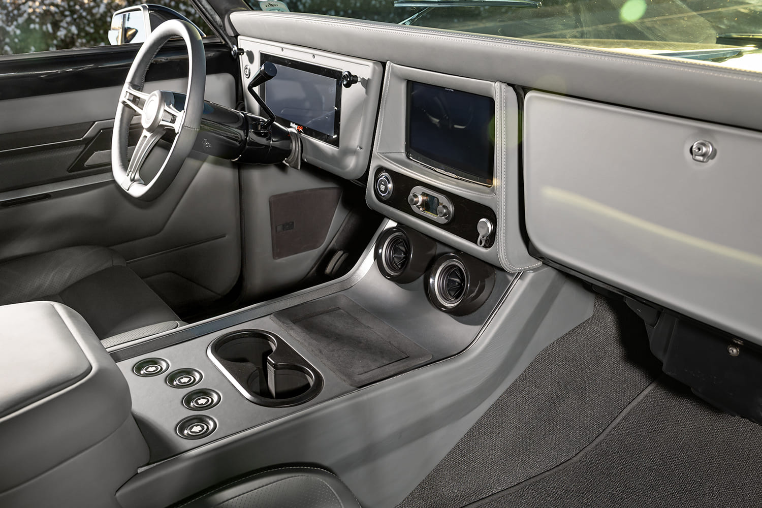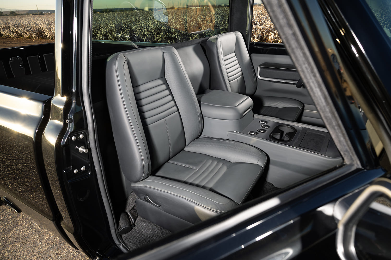 The outside is a whole other ball of wax. Again, clean, simple, and timeless were the themes, so Mike wanted a few subtle body modifications. The front and rear bumpers were tucked tighter to the body, which cleans up the truck a lot. Then there was the paint; Mike knew he wanted a two-tone, but what two colors? Well, that involved a lot of spray-out panels, testing, and asking for his wife’s opinion, but in the end Jason Deering from Premier painted the truck PPG Brilliant Metallic Black up top and PPG Storm Gray on the bottom. Continuing the slick theme, Lucky’s Auto Glass stepped with a front and rear flush glass treatment.