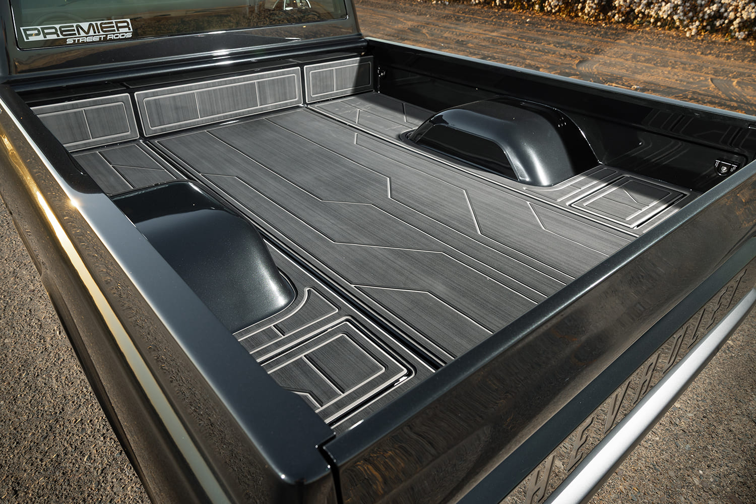 Moving onto the bed, which was narrowed by 1 inch for a better profile and on the inside, the modified floor raises in the middle to show off the chassis. Leveling things up, it was dressed up by a company called Dek-X based in Lake Havasu City, Arizona, right near Premier. Yup, that’s boat decking right there, and it not only gets a lot of attention but it’s functional. Mike can toss his golf clubs in the bed without a second thought. It’s pretty great.