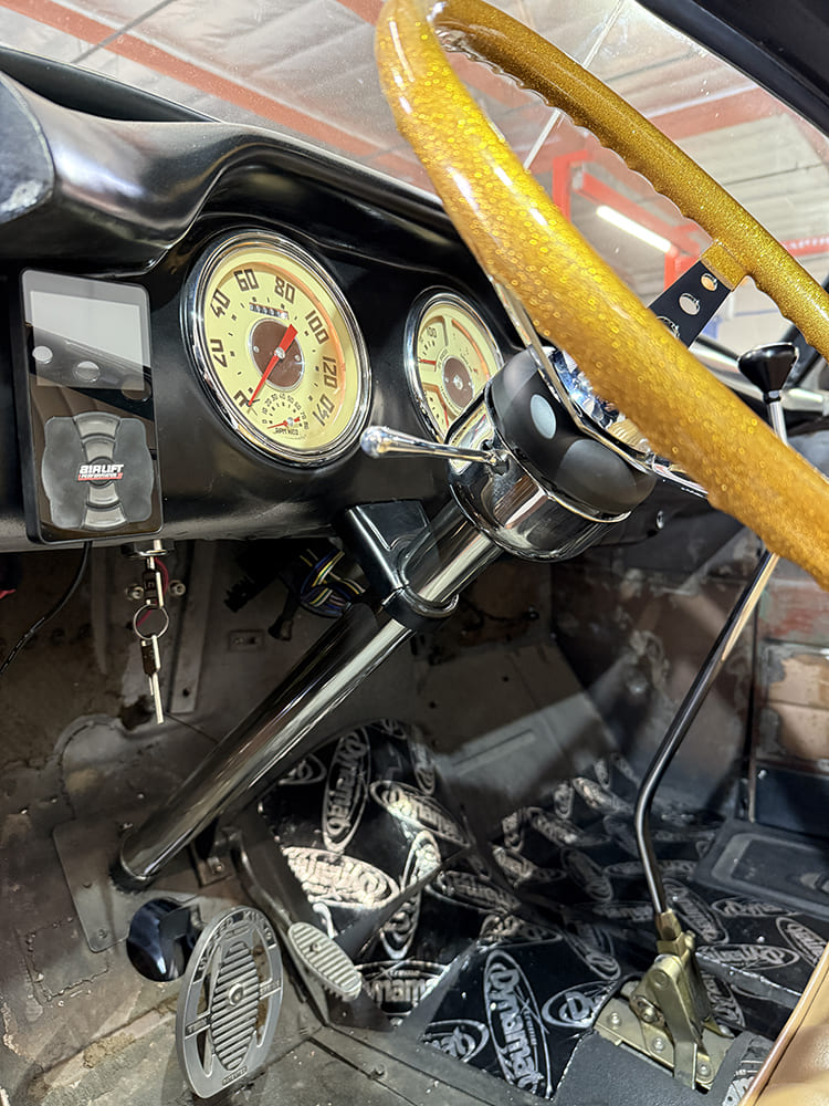 Obviously, a huge tilt column was not in the cards for the ’48, so my options seemed kind of (really) limited at first, until I came across Flaming River’s Nostalgia column (their polished stainless FR1909PL in 30-inch length/1-1/2-inch diameter) and my search was over! Not only was the bell the perfect size for the aforementioned early GM wheels, it also perfectly accepted the metalflake Mooneyes three-spoke wheel I’d just been gifted from Chico at the Grand National Truck Show. Most importantly, it not only solved my wiring situation, it also removed any worries of mechanical failure previously posed by the modified-stock column—plus it looked a helluva lot nicer!