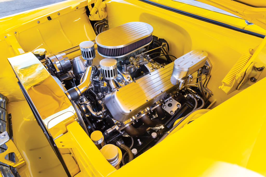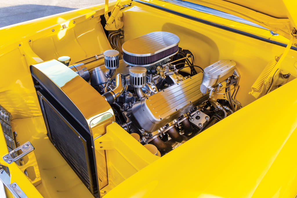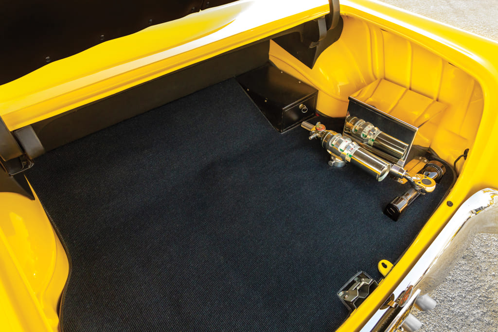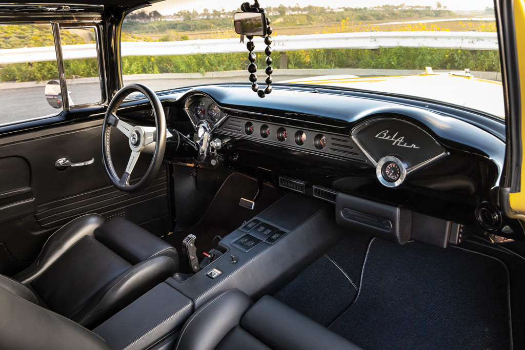 The engine is dressed in a plethora of Shonig one-off billet pieces, including the air cleaner, valve covers, breathers, and the master cylinder cover. “Shonig made these types of pieces before anyone else and way before the aftermarket companies began mass producing them,” Tom reveals. “These parts were showing up on early street rods, but this was among the first Tri-Five to have any billet aluminum accents.”