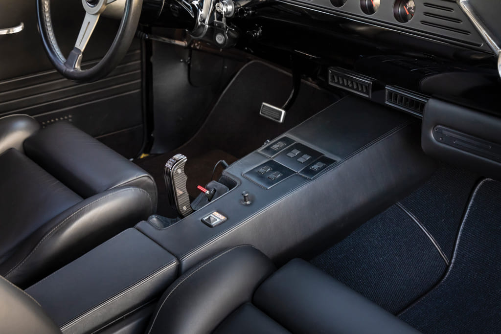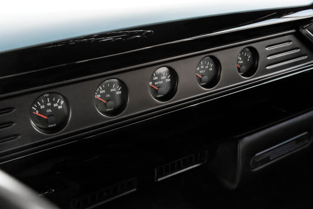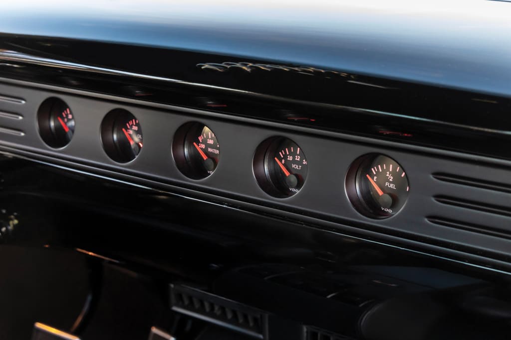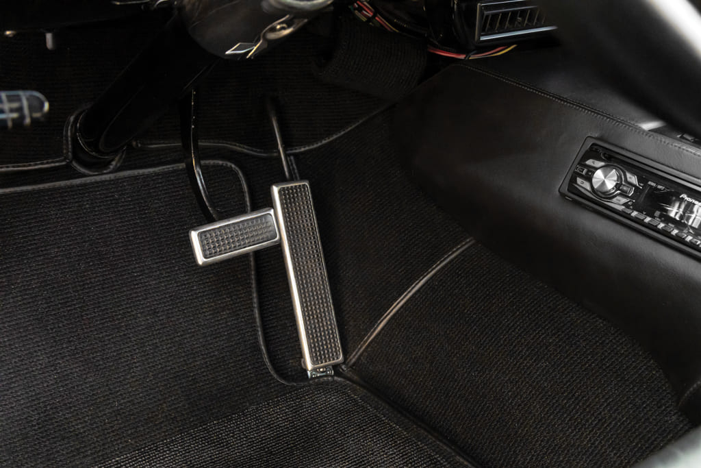 The interior is a museum piece consisting of more one-off billet aluminum art: Woody Gilmore is responsible for the custom aluminum gauge panel and Dave Marasco created the custom-built pedals, the Nardi steering wheel’s horn button, and a plethora of other custom pieces throughout. Vic Kitchen laid out the black German square-weave carpet and black leather interior for a refined performance driving compartment. Recaro bucket seats replaced the stock bench, giving way for the center console that houses the electric window controls, a Panasonic head unit, and Hurst shifter.