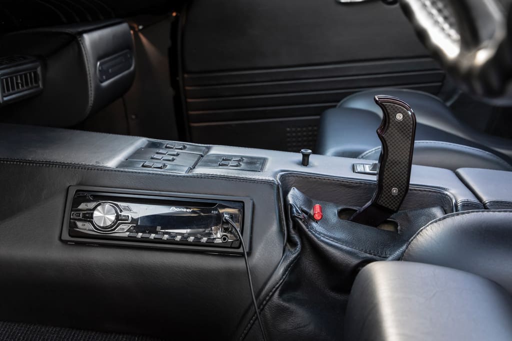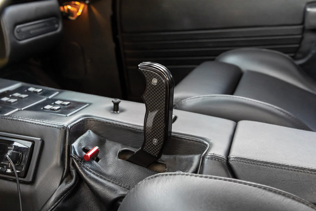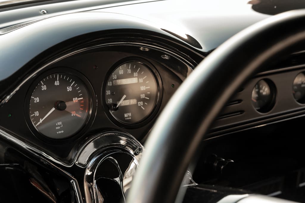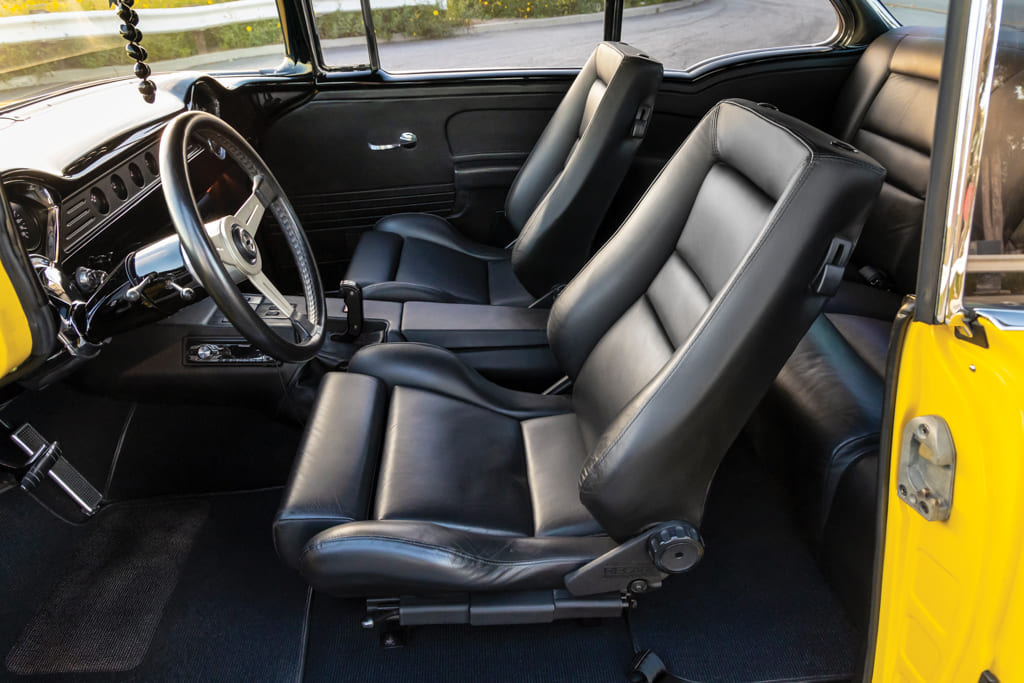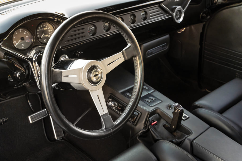 The interior is a museum piece consisting of more one-off billet aluminum art: Woody Gilmore is responsible for the custom aluminum gauge panel and Dave Marasco created the custom-built pedals, the Nardi steering wheel’s horn button, and a plethora of other custom pieces throughout. Vic Kitchen laid out the black German square-weave carpet and black leather interior for a refined performance driving compartment. Recaro bucket seats replaced the stock bench, giving way for the center console that houses the electric window controls, a Panasonic head unit, and Hurst shifter.