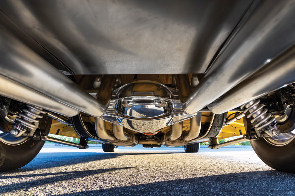 Ebberoth boxed the stock frame for a stiffer, performance-based ride, and built a custom crossmember to accommodate the Orange County Transmissions 700-R4 transmission. Out back is a Currie 9-inch rearend stuffed with an Eaton limited-slip posi unit and 3.50 gears. Shonig set focus on building the stainless four-link suspension system dampened by Ridetech shocks. Up front, Ebberoth worked in a set of NASCAR-style tubular control arms for additional strength and performance, also dampened with Ridetech coilover shocks.
