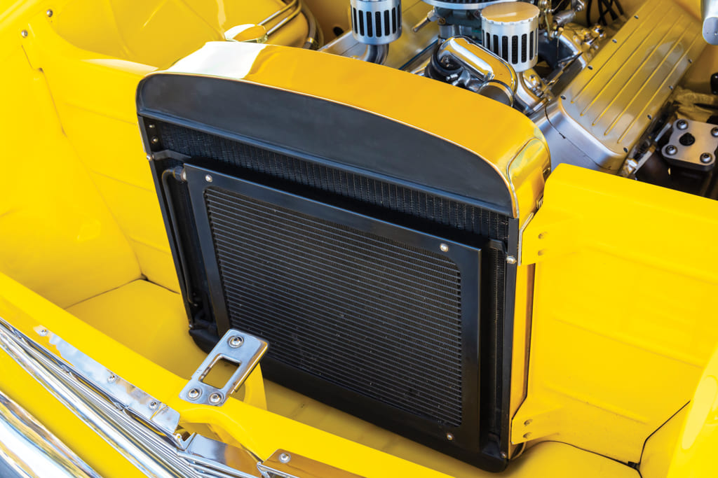 Ancillaries: Jim Babb custom brass-tank radiator, custom aluminum valve covers, breathers, and air filter by Frank Shonig