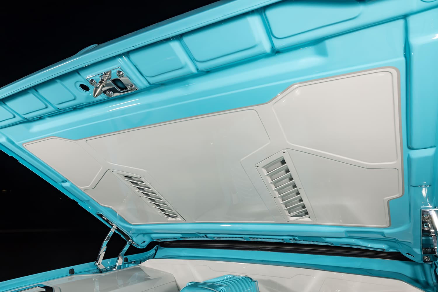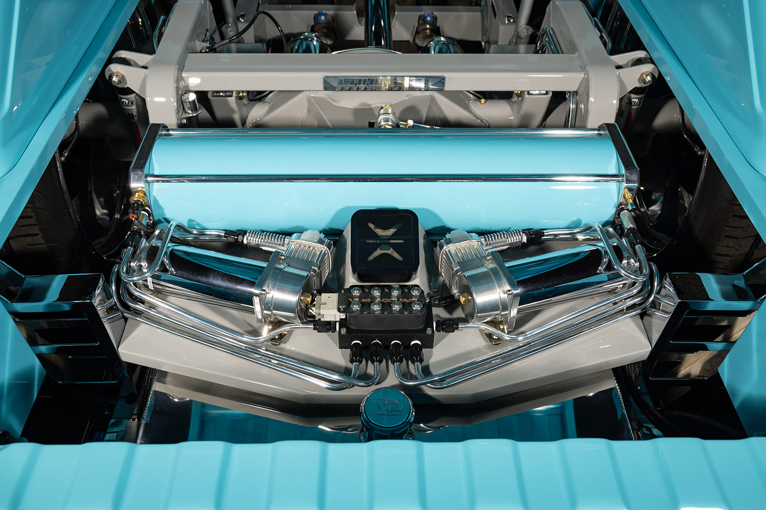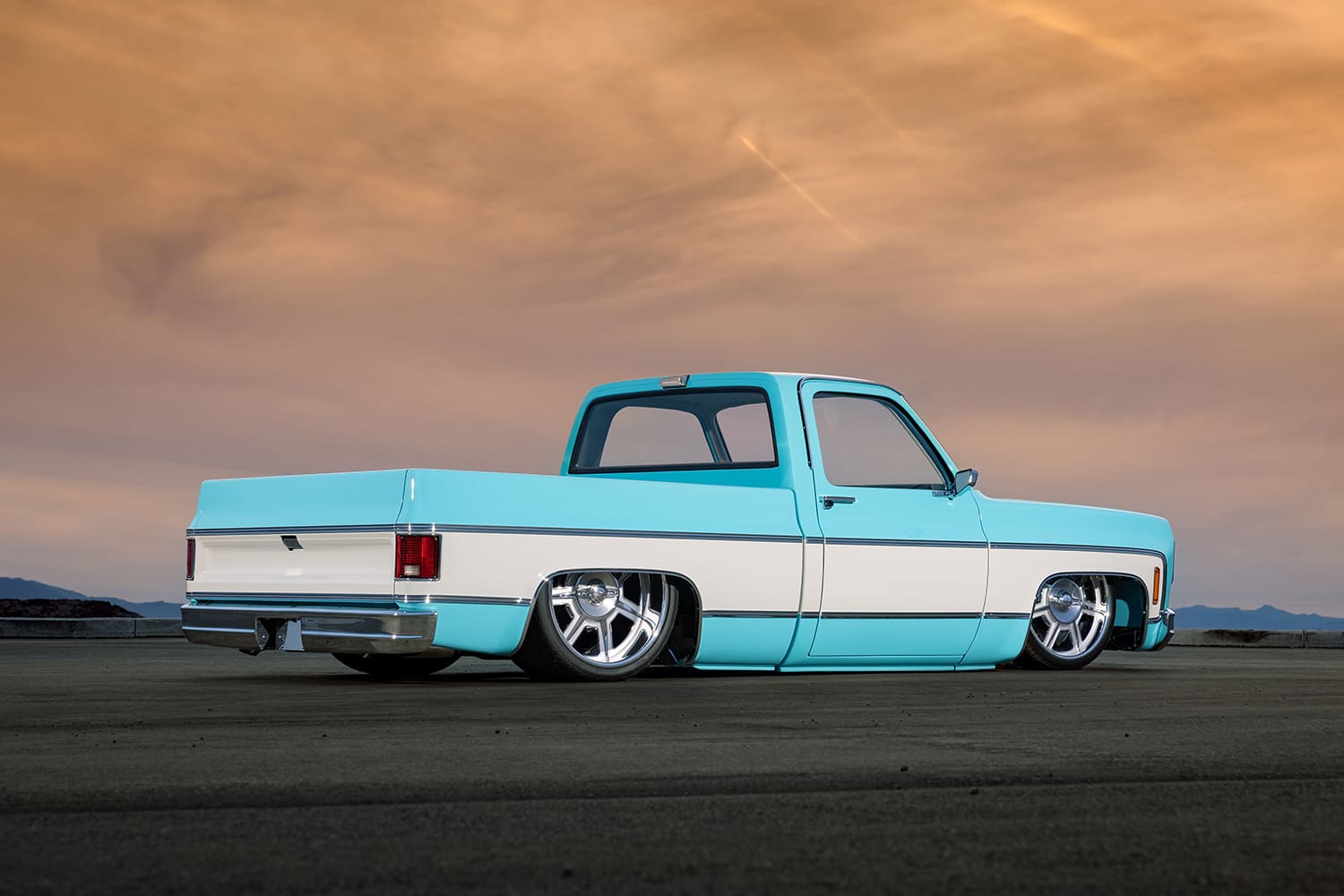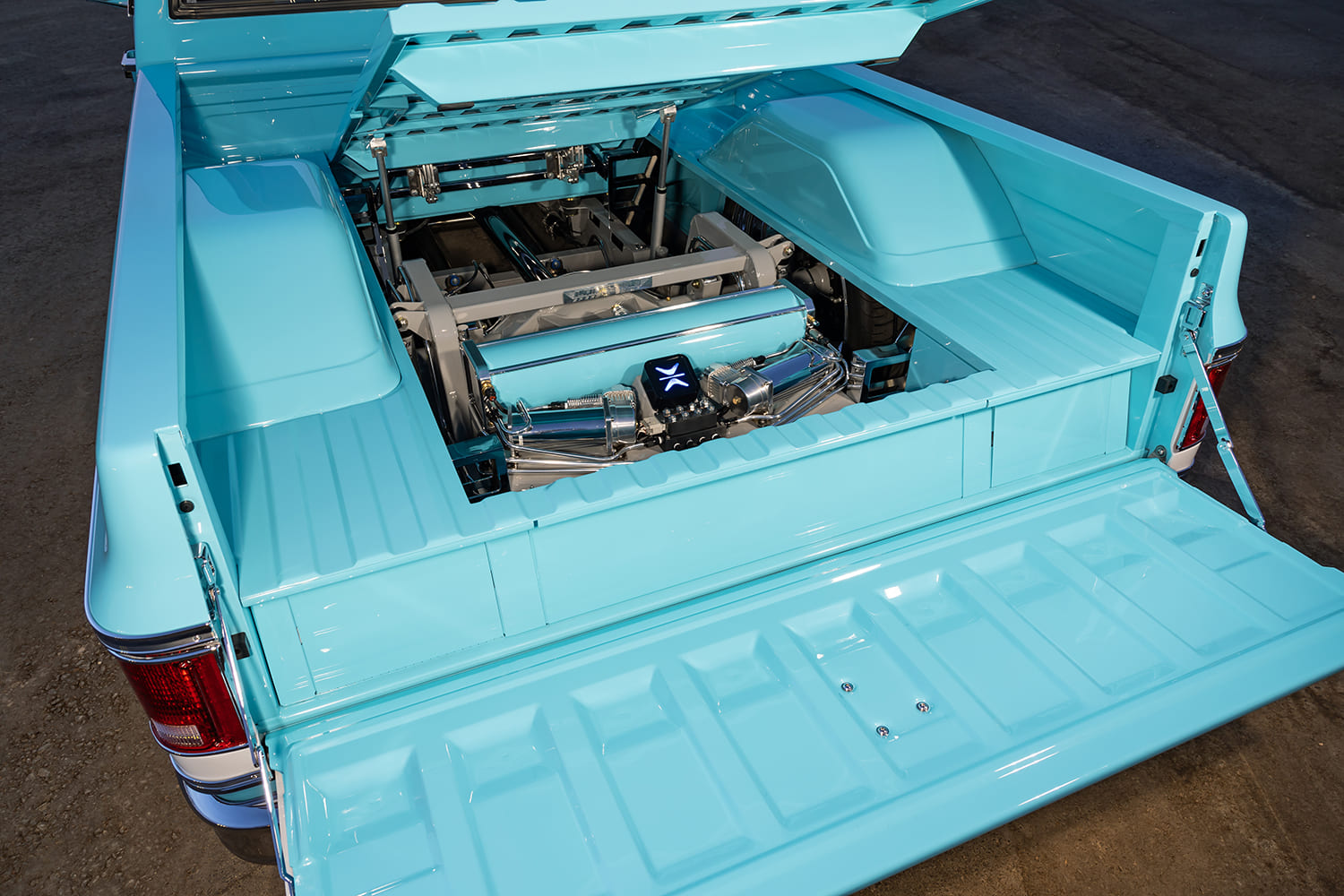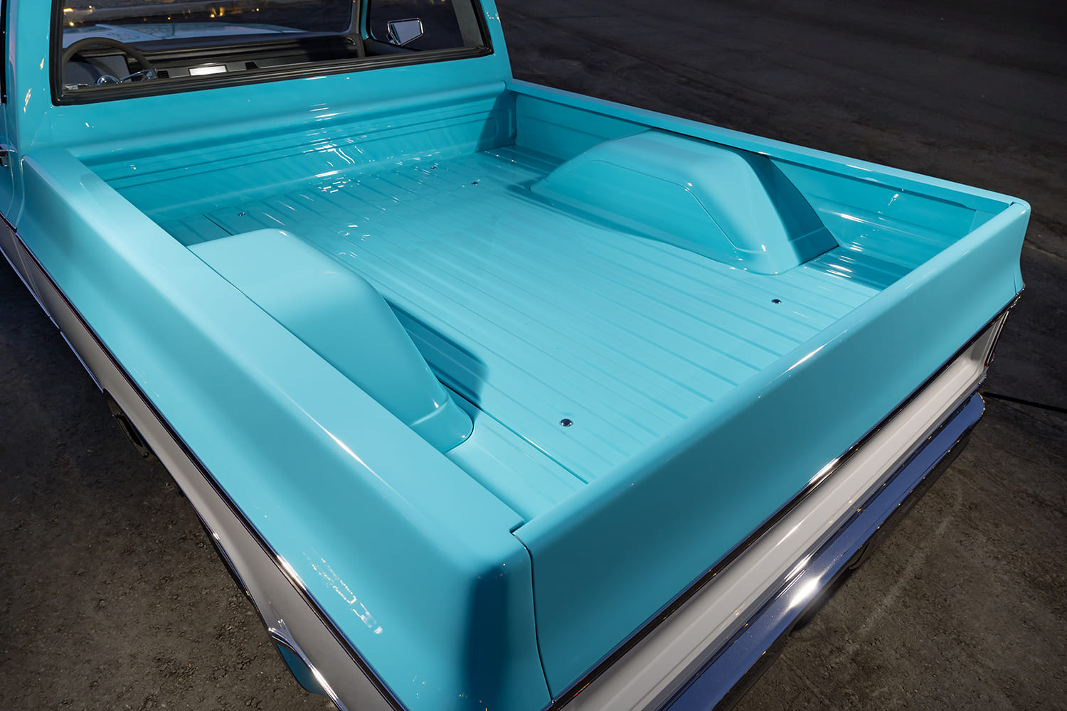 With the C10 taking shape as expected, Jim continued making progress by working his magic on the exterior. His goal was to tighten all body gaps to give the truck a smooth appearance, and there were also a few must-dos on the agenda to make up for its extremely low stance. The bed floor had to be raised, and the OEM wheeltubs required substantial widening to accommodate the oversized wheel and tire combo. Jim obviously did so in style. A center panel in the bed floor allows easy access to the suspension system below, and it’s through this vantage point where the detail work underneath truly shines. The frame and other accessories have been either powdercoated or painted to add protection and a dash of class to a section of the build that isn’t always on full display. The bumpers have been modified, shaved, tucked, and all bolts have been hidden to add to the truck’s streamlined physique. And if you think that’s cool, EVOD Industries also made a one-off billet grille for a truly custom touch. Finishing off the exterior, the two-tone paint scheme does look classic and familiar, the exact color codes are custom mixtures that Jim cooked up and applied himself.