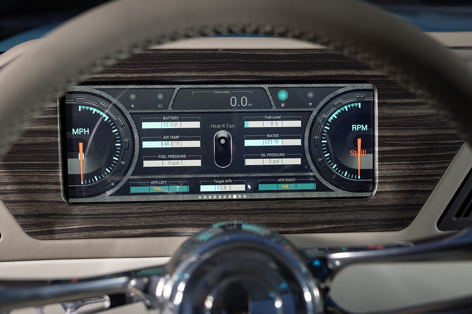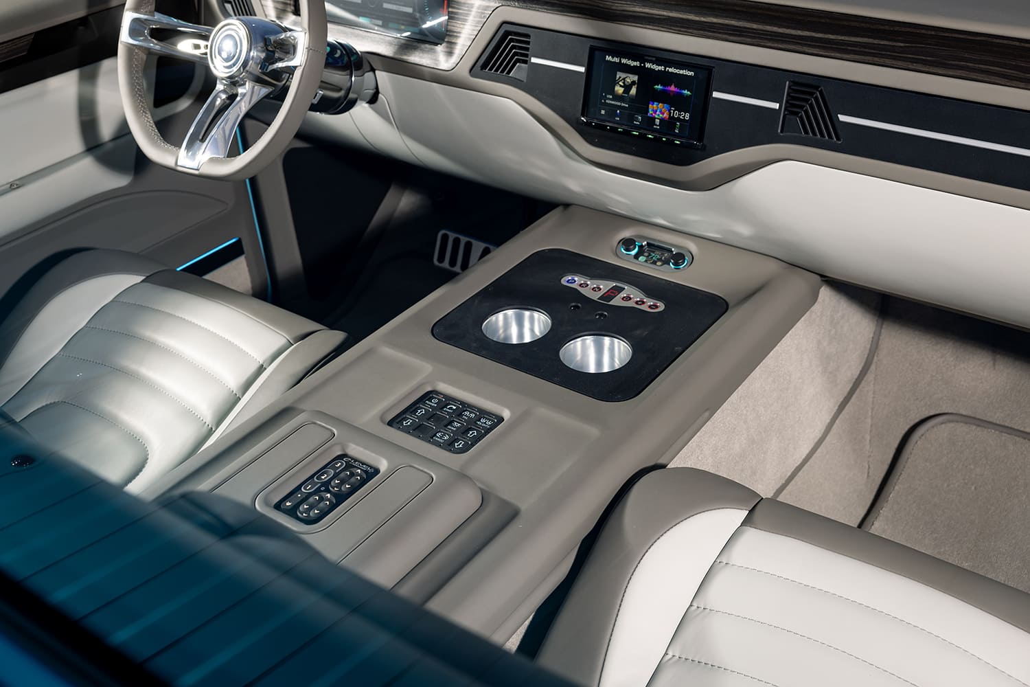 All of Jim’s completed projects are known for being astoundingly well-rounded, which is exactly why he contacted Mobile Toys Inc. (MTI) in College Station, Texas, to lend a hand with the C10’s interior rehab process. Chris Pate at MTI led the charge in hand making custom seats and covering them in two-tone gray leather as well as the headliner Alcantara upholstery. Instead of searching for replacement factory interior paneling, Pate went a step further by 3-D printing a ton of in-cab components, including the dashboard and door panels, which make for a truly unique driving environment. Other highlights include the Holley 12.3-inch Pro Dash unit, a Sparc steering wheel, and Kenwood and Focal audio components that have been expertly installed. The custom center console houses a Switch-Pros master switch panel to allow for easy control of the power windows and door poppers, an Accuair e-Level controller, as well as a Dakota Digital climate-control panel for the utmost level of convenience at an arm’s reach.