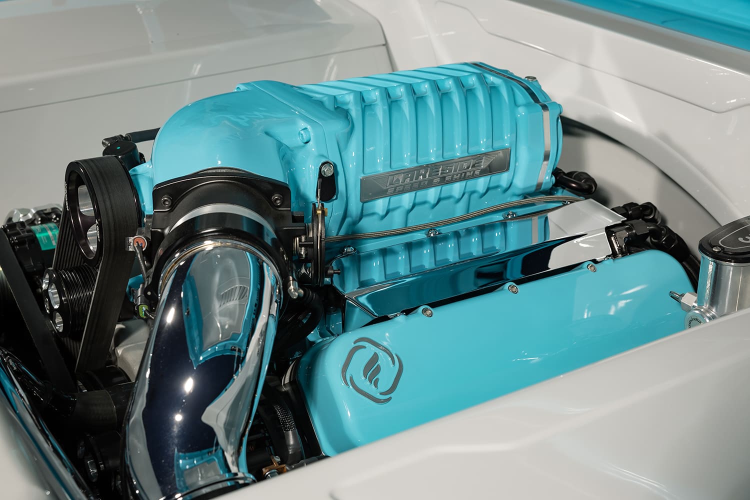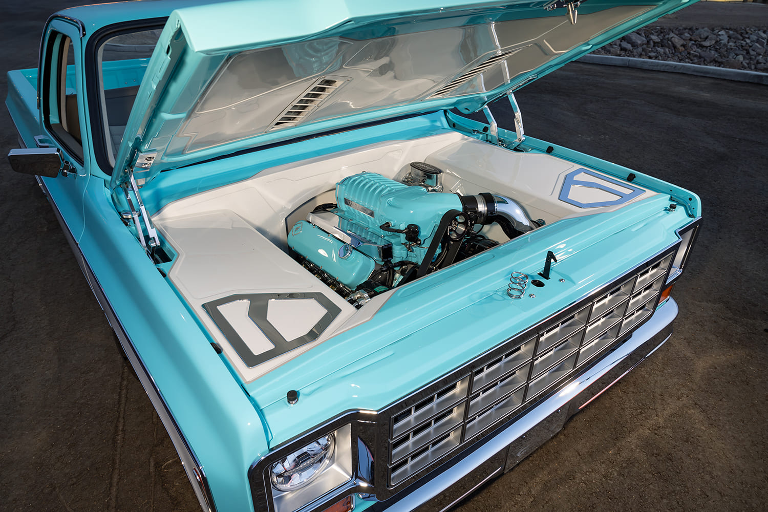 The next phase of the build was to find an appropriate engine for the C10, and nothing short of a Dart LS Next aluminum block with Frankenstein heads would do. A Whipple 3.0L supercharger was also thrown into the mix, as was a Holley Dominator fuel injection system, an Aeromotive fuel pump, Spectra air cleaner, and a set of Ultimate Headers that expel spent fumes though a 3-inch MagnaFlow exhaust setup. A 4L80E transmission with a 2,800-stall converter from Gearstar has been brought in to back up the high-powered LSX that functions through a GSM push-button shifter, all wired up with the rest of the truck by Jesse Webb at Lakeside. A Ford 9-inch rear housing with 3.73 gears and 35-spline axles from Strange Engineering have found their way onto the C10’s impressive driveline lineup, which boasts an estimated output of 1,000 hp with 720 lb-ft of torque! A proper amount of paint and fabrication work showcase the Chevy’s powerplant in a museum-quality presentation. Oh, and don’t forget to look up at the network of paneling found on the underside of the hood! The attention to detail here is insane.