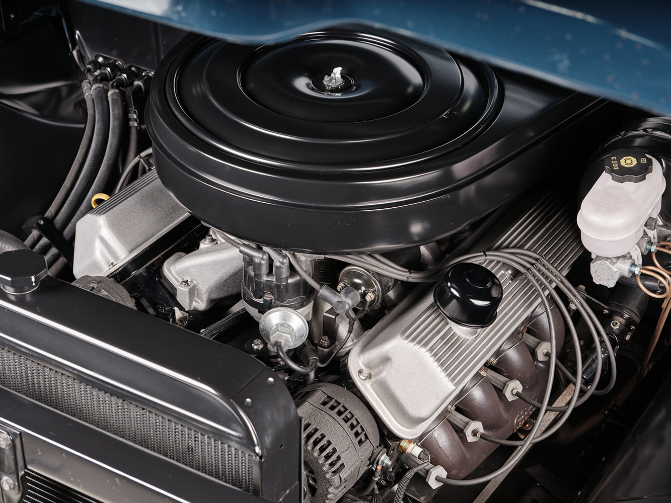 While the exterior is an actual military conversion, Alan’s crew of Jon Barefoot, Maria Garcia, and John Fischer went to great lengths to convert it even further: From the 1964-72 F-100 tailgate skin sandwiched to 2018 Chevy truck internals (again, similar to the 1957 F-100) to modifying the bedsides to flow with the back of the cab to moving the front wheel openings forward and down, that Axalta Air Force Blue (applied by none other than Boris from Street Machinery in his signature perfect-patina fashion) is covering a ton of non-stock work! Lastly, on the inside, as Alan previously mentioned, vintage fabric (over Johnson’s Hot Rod Shop–fabbed seats) and rubber mats were commissioned to accompany modern amenities, such as Classic Instruments gauges, Vintage Air Gen III A/C (both powered by an American Autowire Highway 22 harness), and a custom-made CON2R steering wheel atop an Ididit column.