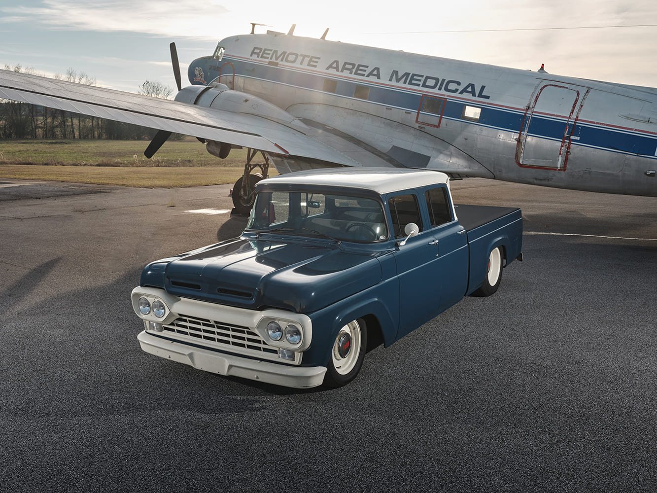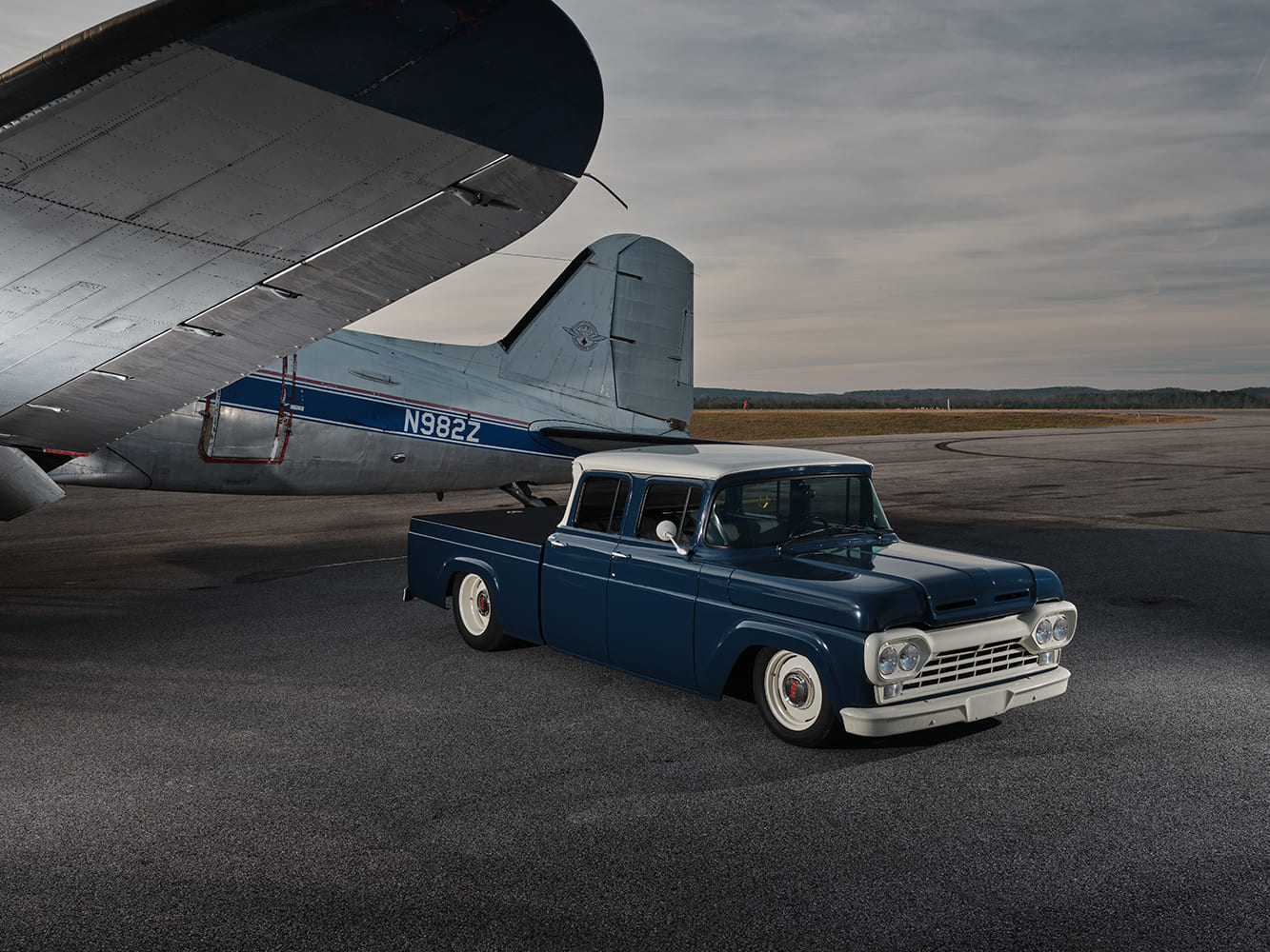 03 1960 Ford crew cab pickup blue and white stance build vintage DC 3 backdrop runway scene