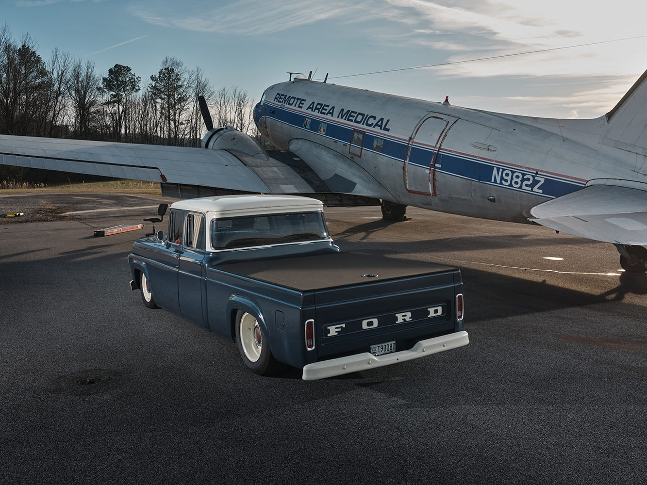 06 1960 Ford F 250 crew cab side profile stance slammed custom pickup airport airplane tail