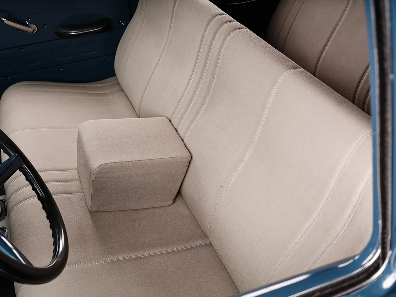 16 1960 Ford crew cab interior tan bench seat armrest upholstery detail restored cabin trim