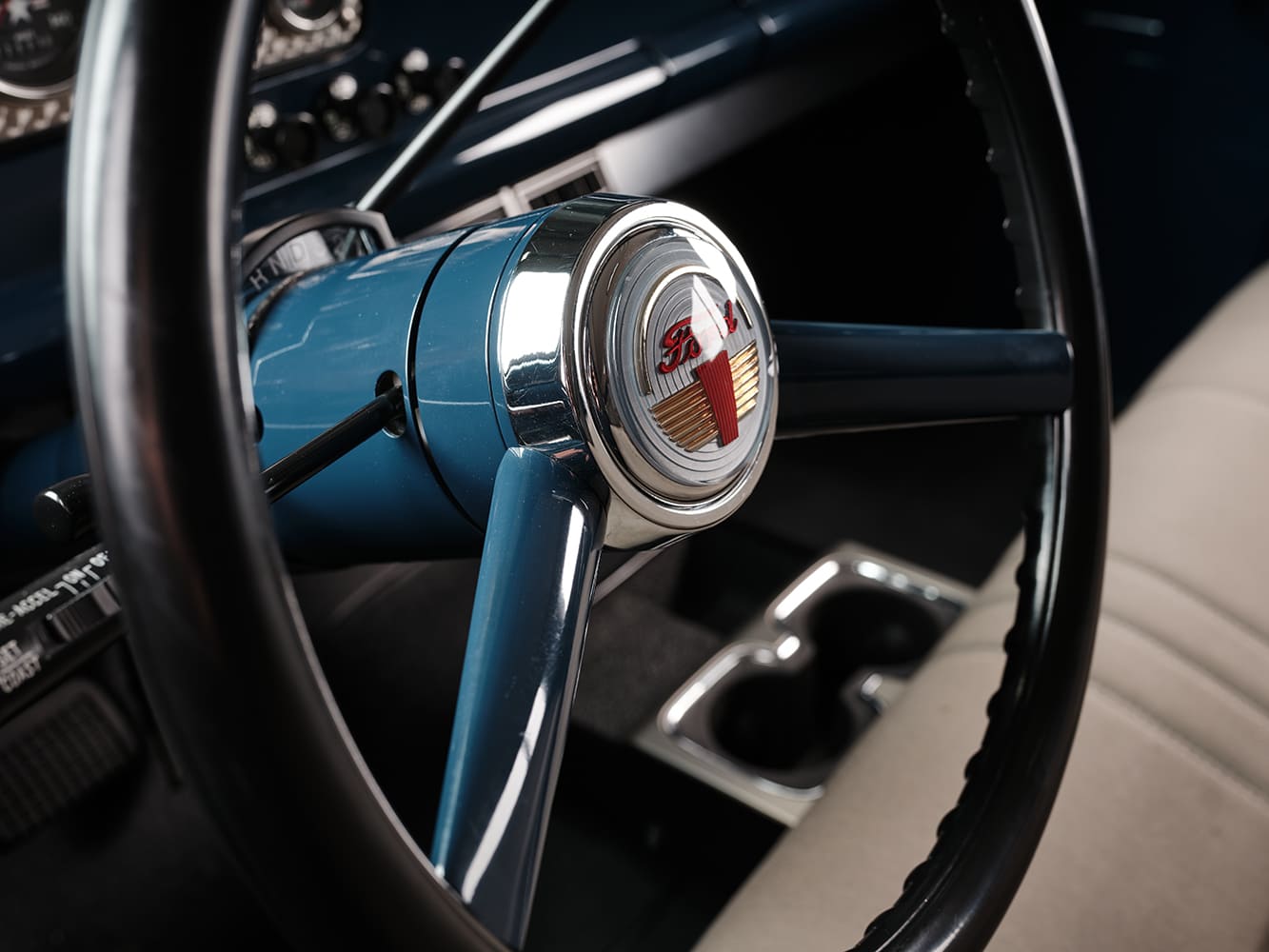 18 1960 Ford steering wheel close up blue column horn button Ford crest custom resto mod setup