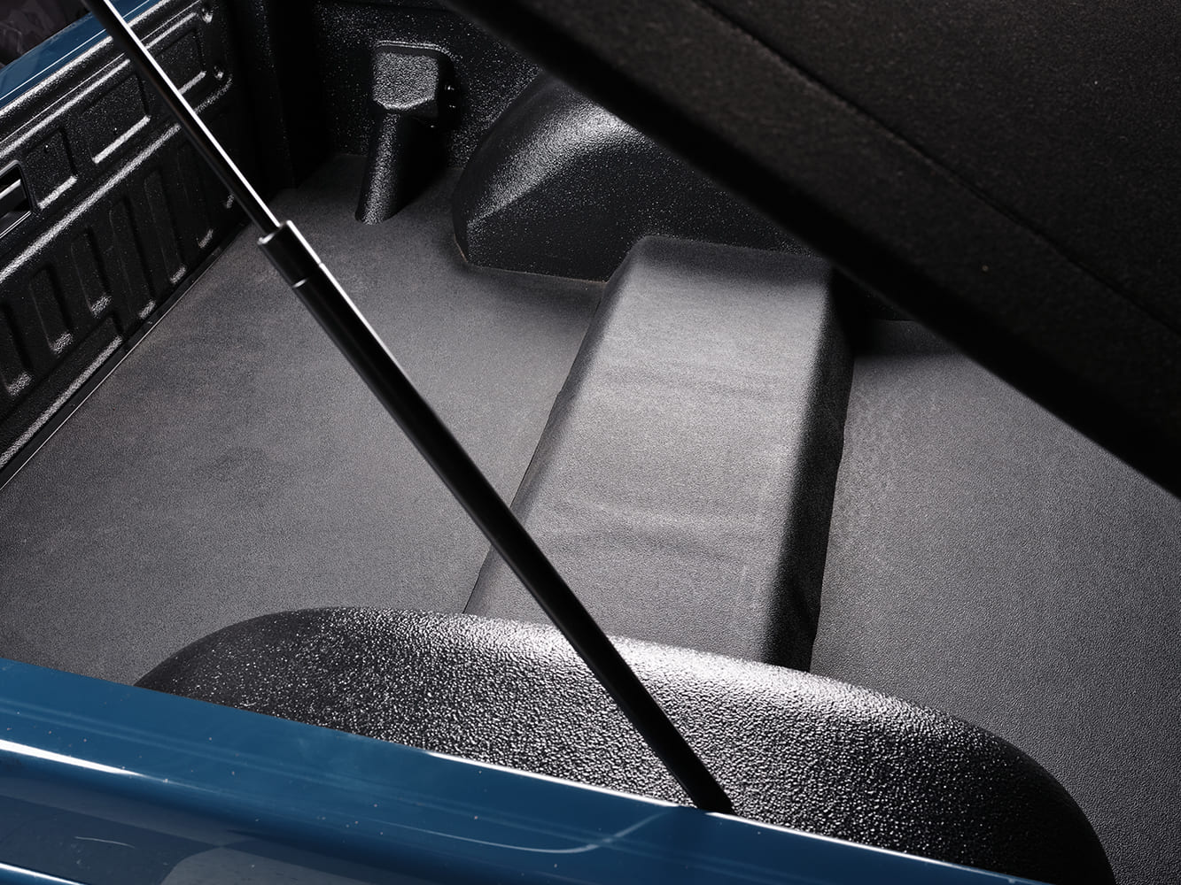 19 1960 Ford F 250 bed liner spray on textured black coated fuel tank notch cover under bed