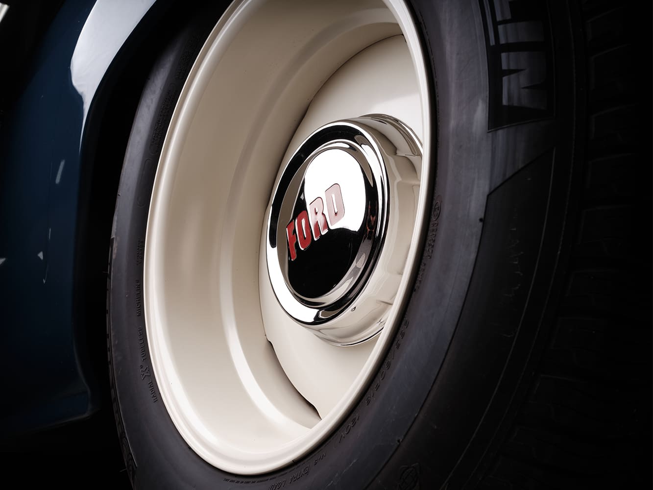 Back in March 2021 George and Alan started the conversation regarding having a ‘driver’ turned into the actual construction of his original Air Force–conversion 1960 Ford crew cab—and by June of the following year that had become a reality on four wheels.20 1960 Ford steel wheel detail cream color hubcap chrome red lettering Michelin tires classic look