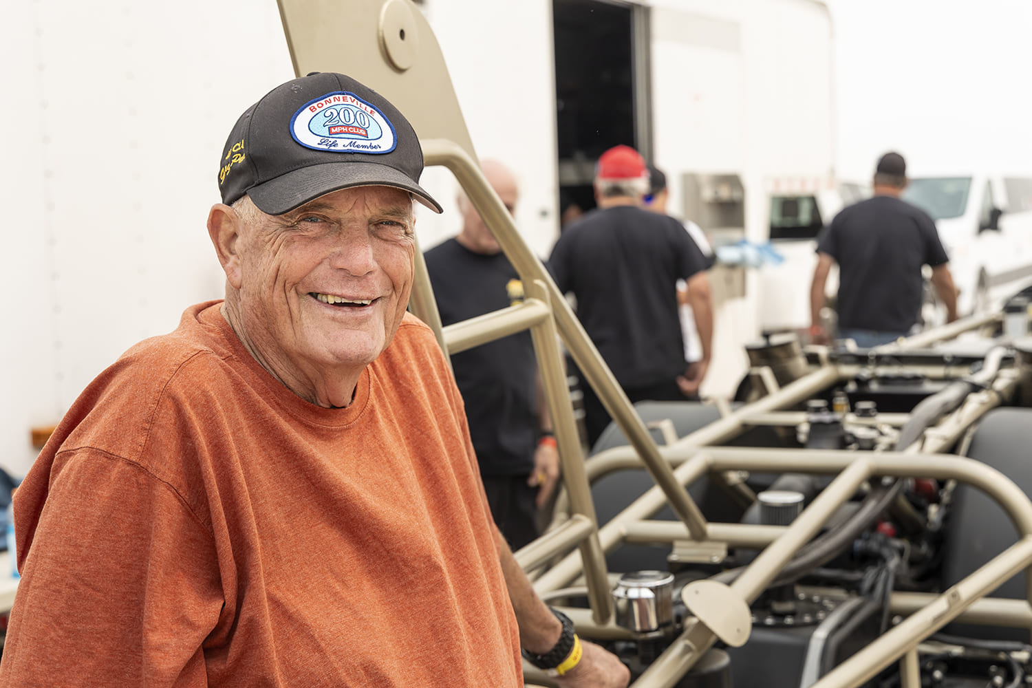 The crew cab is based on a (longer than usual) Roadster Shop REVO Stage III chassis (Wilwood brakes, Fox coilovers, and rolling on Johnson Heritage Series 17/18-inch billet steelies) and, similar to his ’57 Holman-Moody–inspired F-100 you surely recall from our June ’21 cover, is powered by a Holman-Moody–disguised LS3 (valve covers, carburetor-looking Holley EFI with coil packs hidden inside the HM air cleaner, and so on) and Bowler 4L70E.21 George Poteet wearing Bonneville 200 MPH Club hat beside land speed race car chassis at dry lakes event