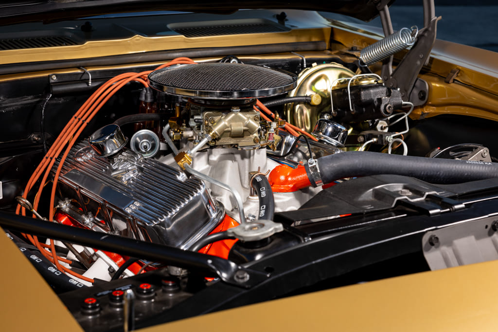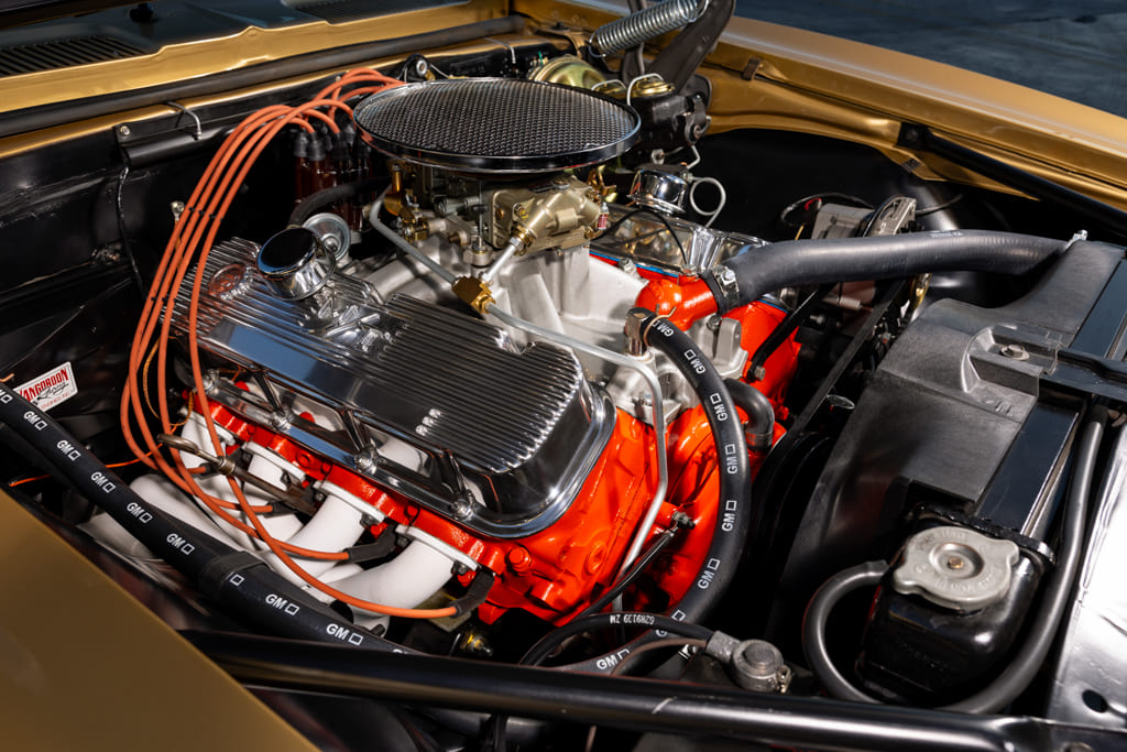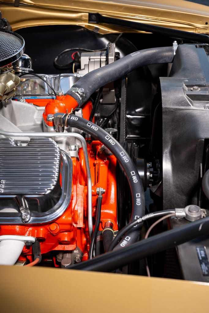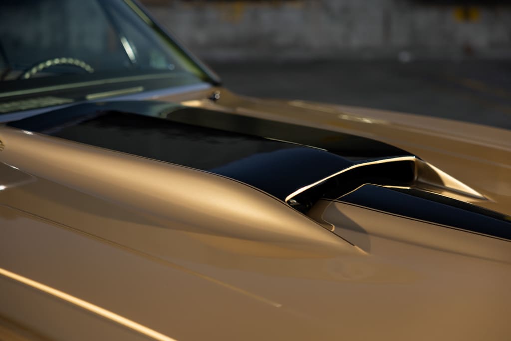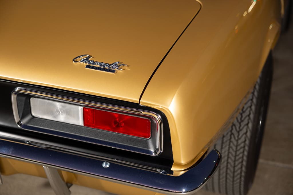 The Camaro’s original exterior paint was in passable condition, and Chas felt it best to recruit both Luis Valdovinos to perform some amazing metal finishing work and Sebouh Babikian to reapply an even coat of fresh PPG Granada Gold paint to spruce up the car’s surface. An OER fiberglass stinger-style hood features a painted stripe along the top that was done with help of a stencil that Chas’ dad, Eddie, created specifically for the job. This really was the only other body add-on made to this ’67, save for some fresh chrome dipping of factory exterior parts.