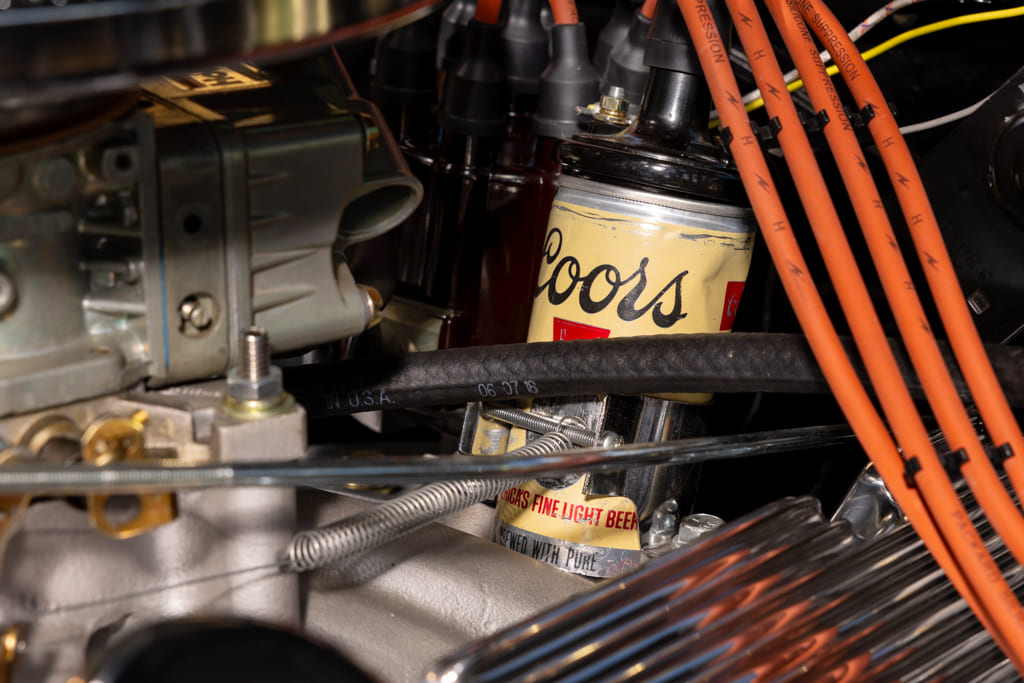 Dress Up: N.O.S. Cal Custom “Fly Eye” air cleaner and polished Mickey Thompson valve covers, Coors can on the coil