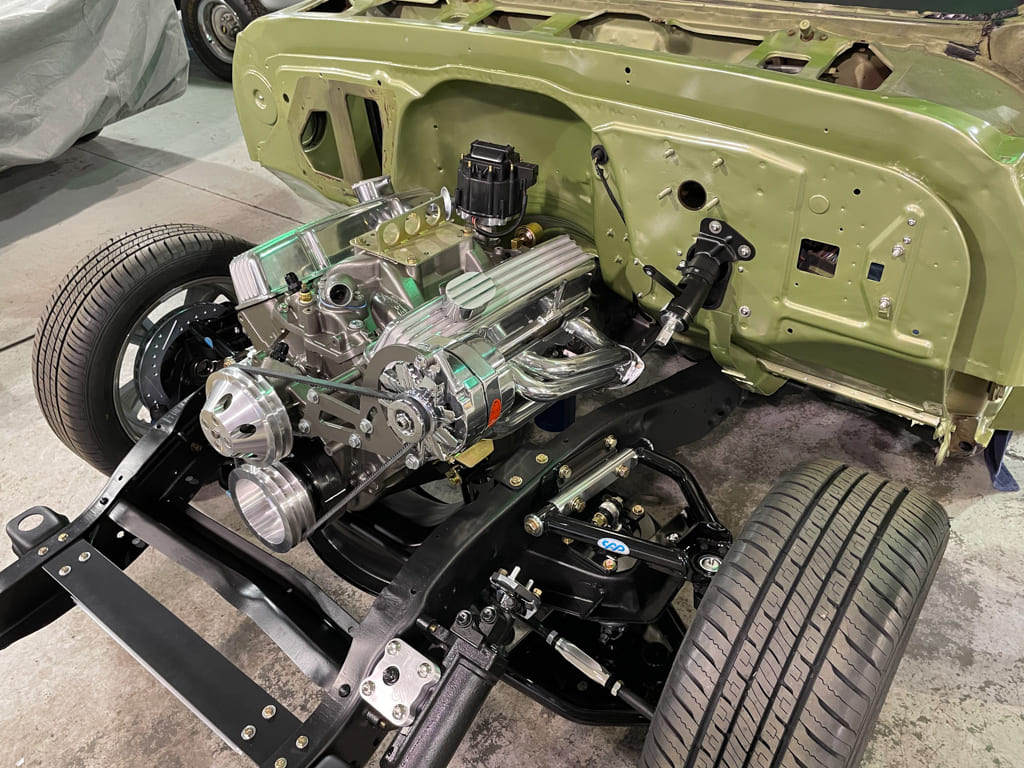 Miscellaneous: Given the fact we were going this deep into the truck for suspension and drivetrain, it just made sense to pull the front clip to do some frame and firewall paint. Pictured is Vic putting in some of the numerous hours that went into getting the frame slicked and clean for paint. Then the firewall was sprayed with a fresh coat of the Medium Olive Metallic, as well as the inner tops of the fenders and related Vintage Air plates for the A/C install. Then two new AMD inner fenders, the factory core support, and all the related brackets and battery tray were sent to Black Label Coatings for their “Signature Satin Black.” Their work is second to none and the durability gained will make these parts last for a long time. Once painted, the front suspension and steering assembly began.
