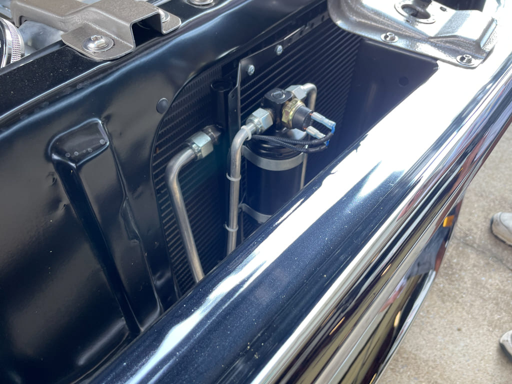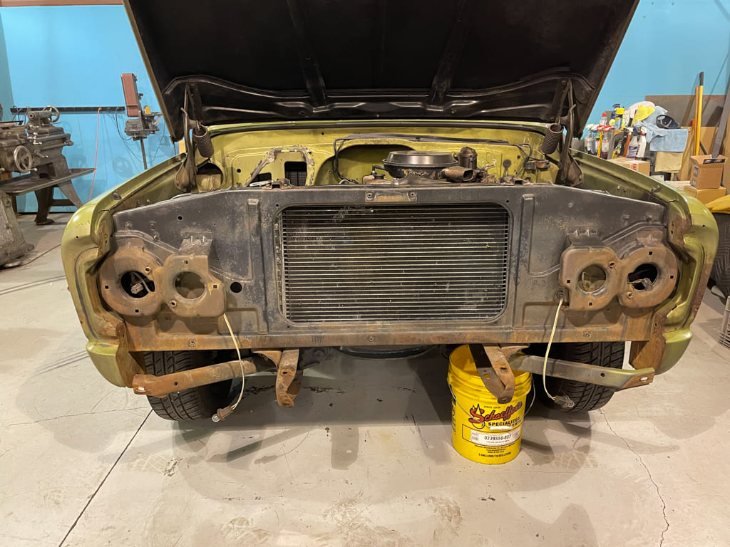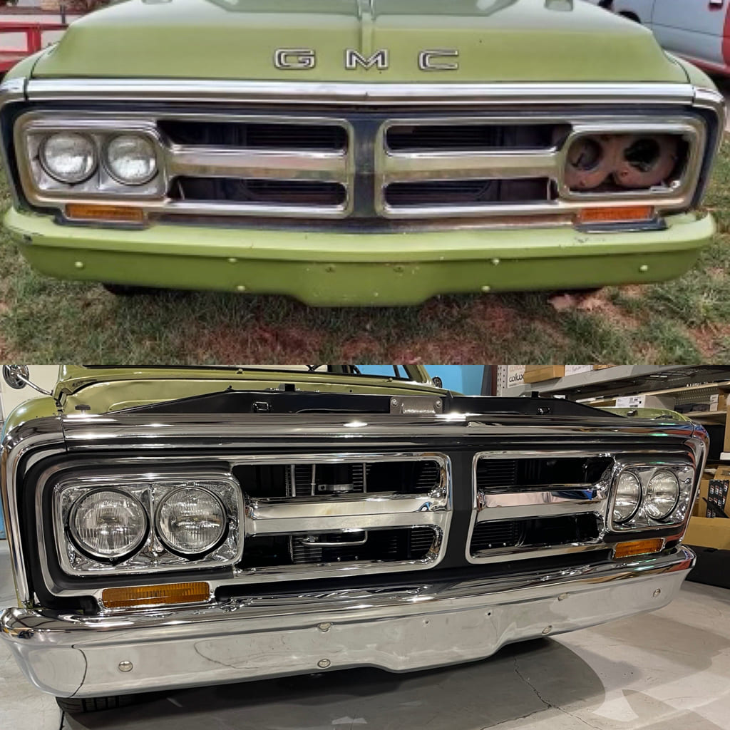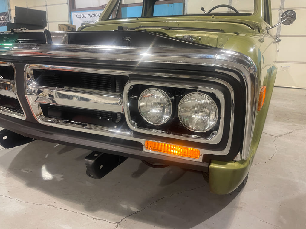 Utilizing more AMD parts and some fresh paint on the fenders, the entire grille was replaced with a new one, including the headlight bezels and fender extensions. The lights were regrounded as well and the parking light housings restored with new lenses when reinstalled.