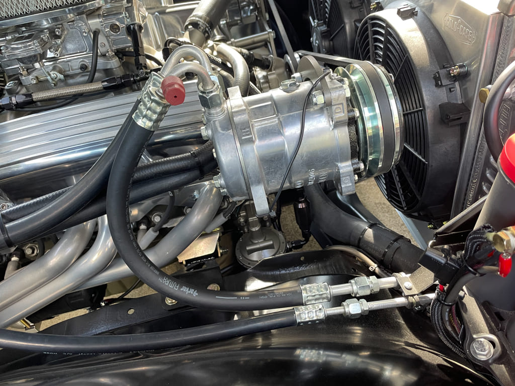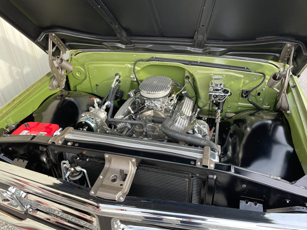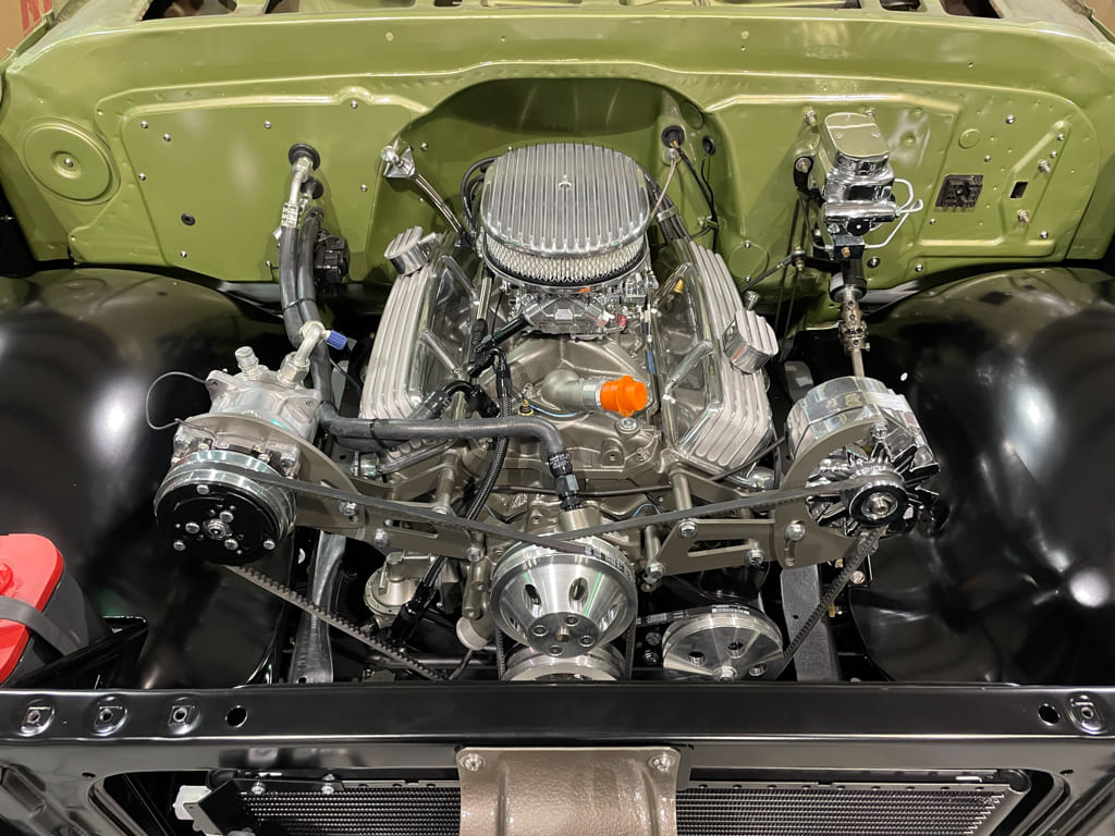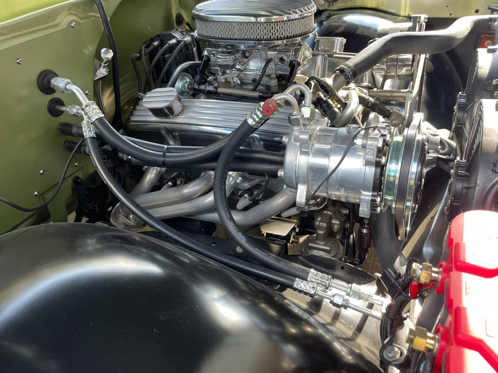 Engine: For the engine we stayed with the tried-and-true SBC dressed in vintage fins. Basically stock, with the exception of an MSD Street Fire HEI, Edelbrock intake, Carter fuel pump, Sanderson headers, Comp Roller Tip Rockers, and a Boss Hog 2000 stall converter, the performance is more than adequate for a cruiser. Using Powermaster for the starter and alternator is an amazing upgrade above stock and the Optima 34/78 never fails. All plumbing is Fragola AN fittings; Gates “Powergrip” Heat Shrink Hose clamps were used throughout for a clean look. Lokar Performance Products throttle and kickdown cables/brackets were utilized along with their engine and trans dipsticks. Billet Specialties wire hold the plug wires nicely with Alan Grove brackets for the front accessory drive. The engine is cooled by a Cold Case radiator with dual fans. The truck goes down the road smoothly and maintains its 180-degree temp regardless of the situation. The end result of all the work is an underhood that leaves little indication that it’s in a truck with such a well-worn exterior. It’s an engine worthy of a second look but usable and cleanable with a good hot rod deep tone from MagnaFlow round mufflers turned down just before the axle.