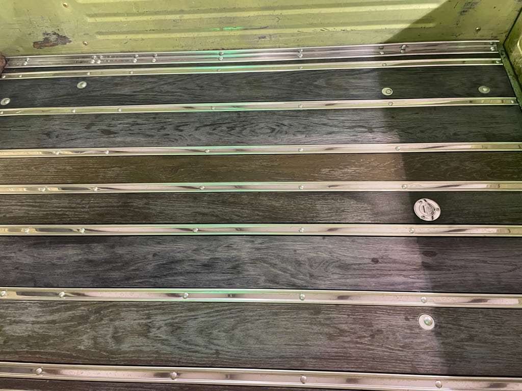 The owner, who is an avid woodworker, did his own bed floor utilizing a process of vinegar and steel wool to produce a patina gray finish with stainless strips and the polished gas cap for the relocated gas tank put back behind the rearend.