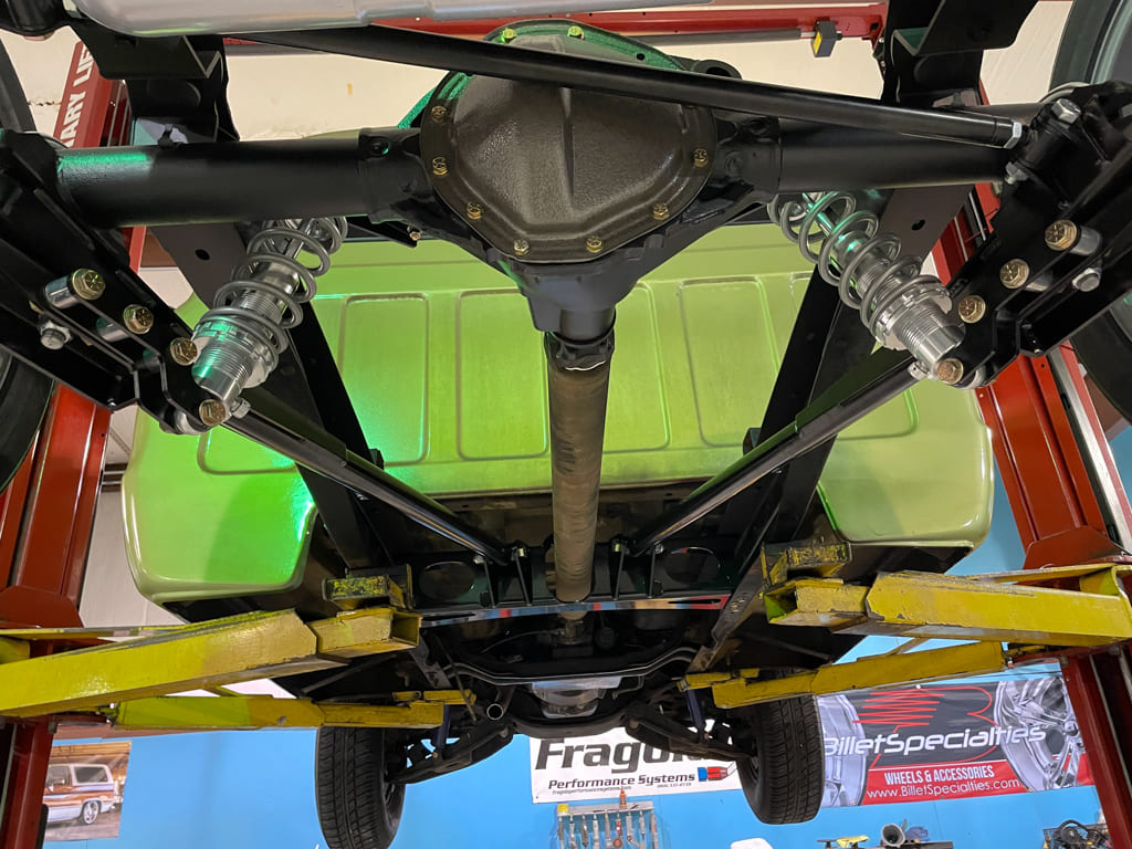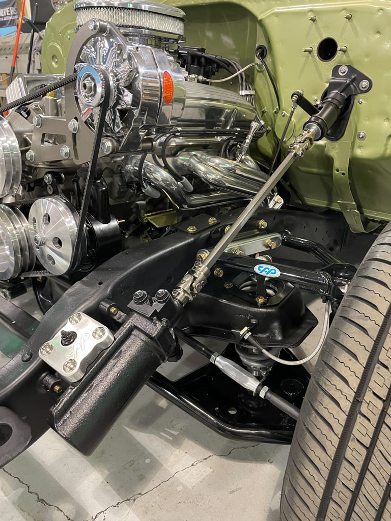 The next call was to CPP’s Sadie Ries who, in keeping with CPP’s word, got us with the proper people there to get our suspension, steering, and other chassis items en route. They contributed a full coilover suspension with all tubular control arms, sway bar, large-diameter four-wheel disc brakes with master cylinder, related e-brake components, 500 Series power steering conversion, and their tilt steering column. We also utilized their engine mounts for the small-block swap, transmission crossmember, and trailing arm crossmember to keep our geometry right with the drop and be able to pass the exhaust through it, keeping it above the bottom of the truck where it’s better heard than seen.