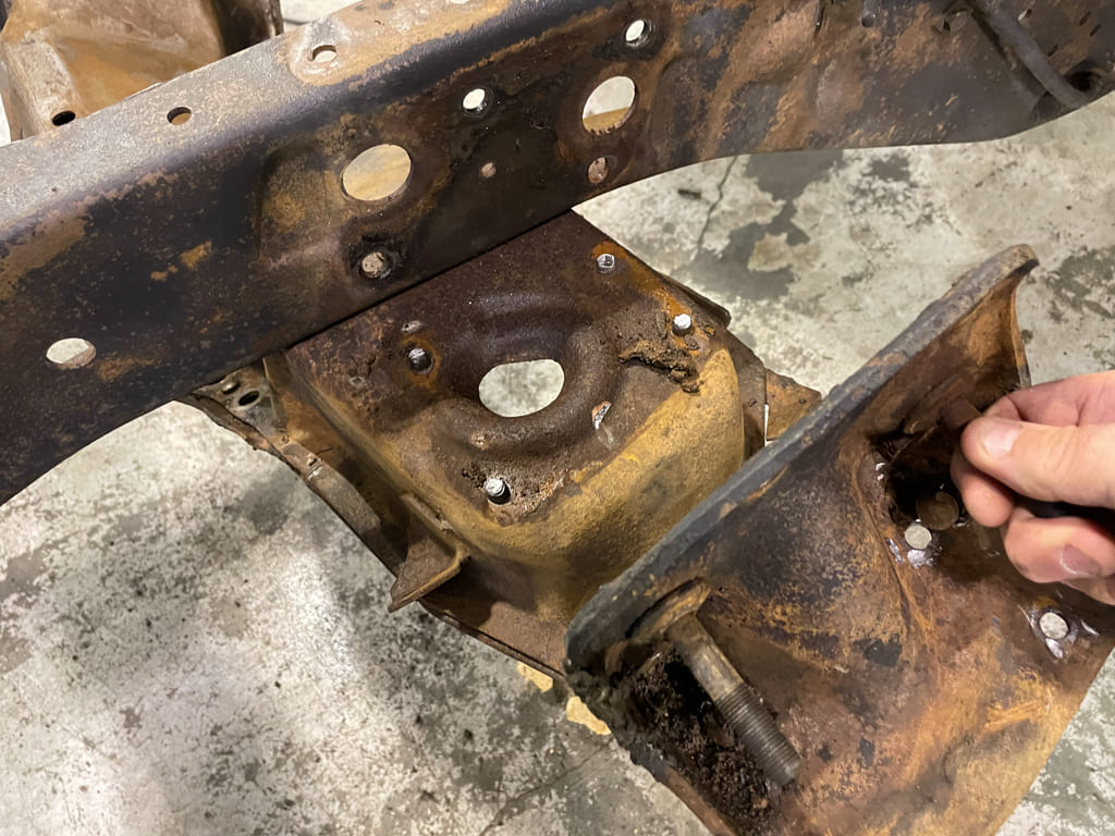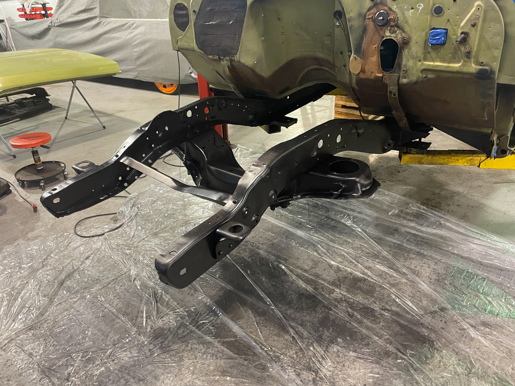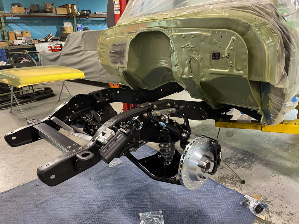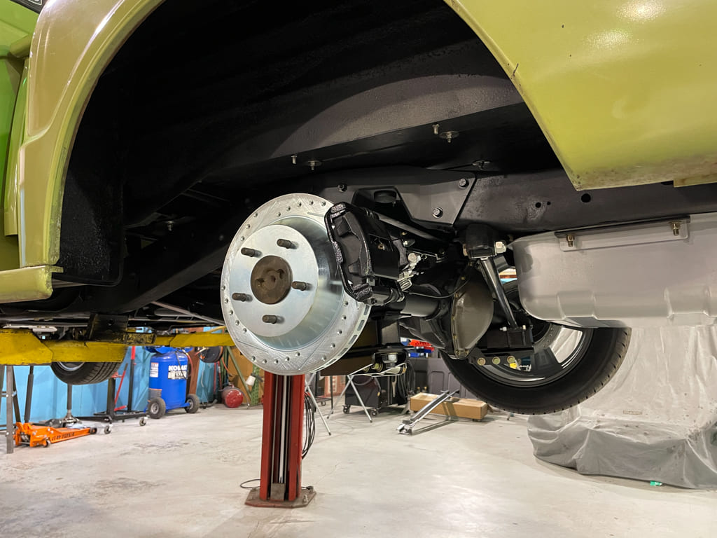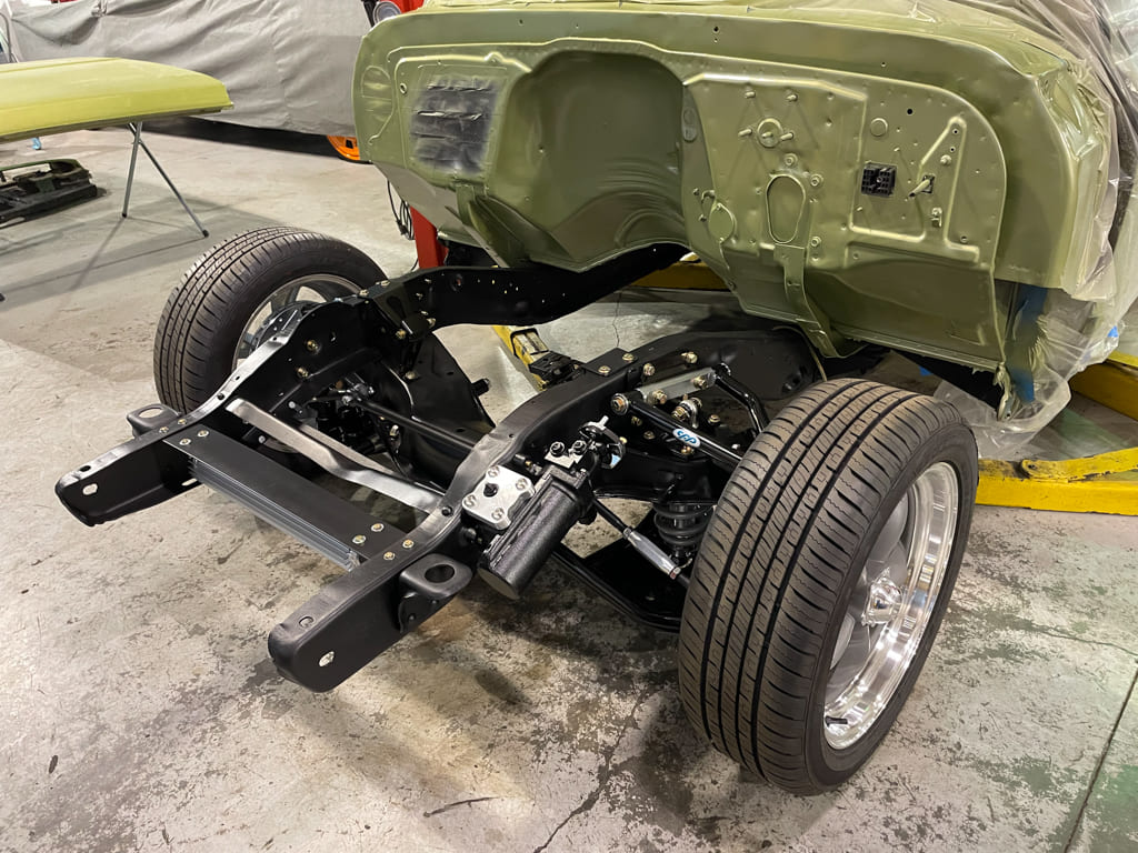 Once safely in the air and supported, an air chisel was used to remove the factory center trailing arm crossmember for the install of the CPP unit which corrects the “droop” of dropped trailing arms and gives the exhaust some holes to pass through. We’ll be needing those for the 2.5-inch MagnaFlows later. The chassis was stripped, prepped, and painted before final assembly.