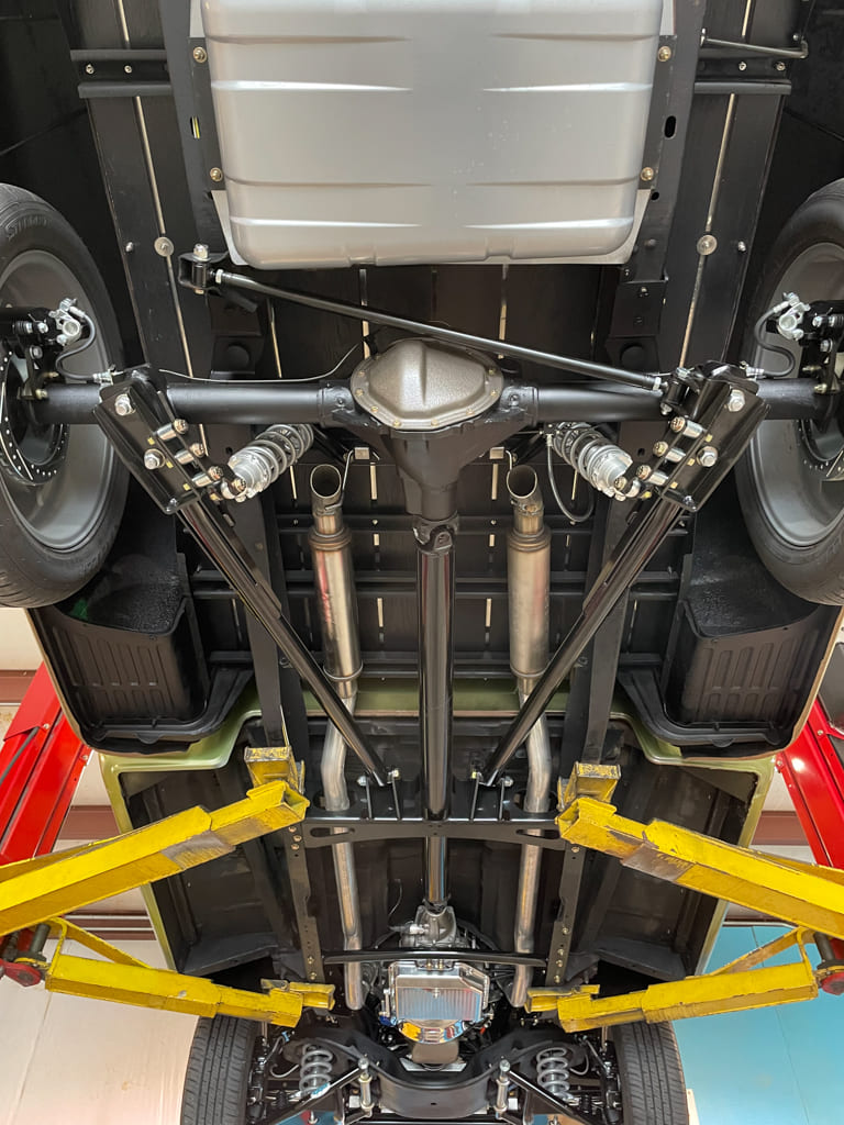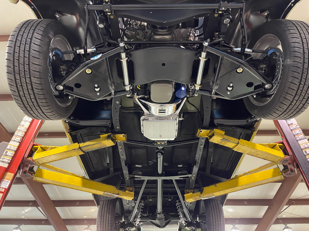 The finished chassis is clean and detailed yet still usable with durable finishes that can be cleaned. The transmission got Fragola AN lines to the cooler, as well as an aluminum pan that has a convenient drain for service.