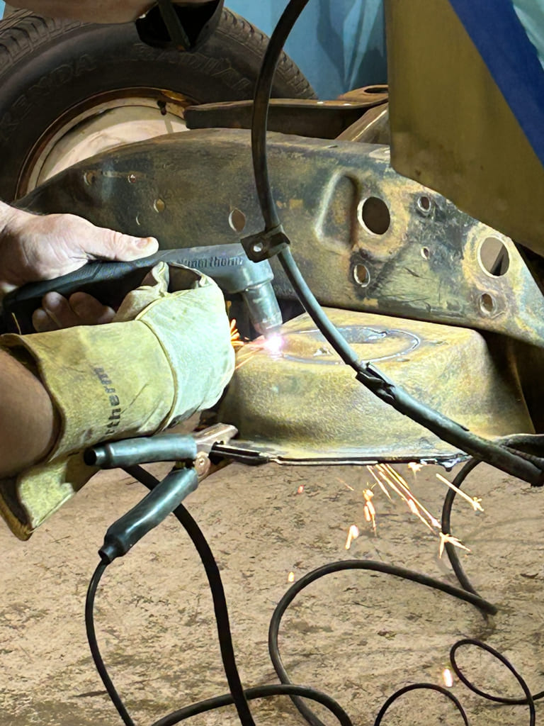 The first order of business out back was to create room for the axle to live right once the drop was achieved. Since I like to run thick sidewall back tires, we tend to need more drop to get the truck down over them. I use a Hypertherm Plasma Cutter for the bitch cutting to keep cuts clean and eliminate overlapping cut lines that can lead to trouble later.