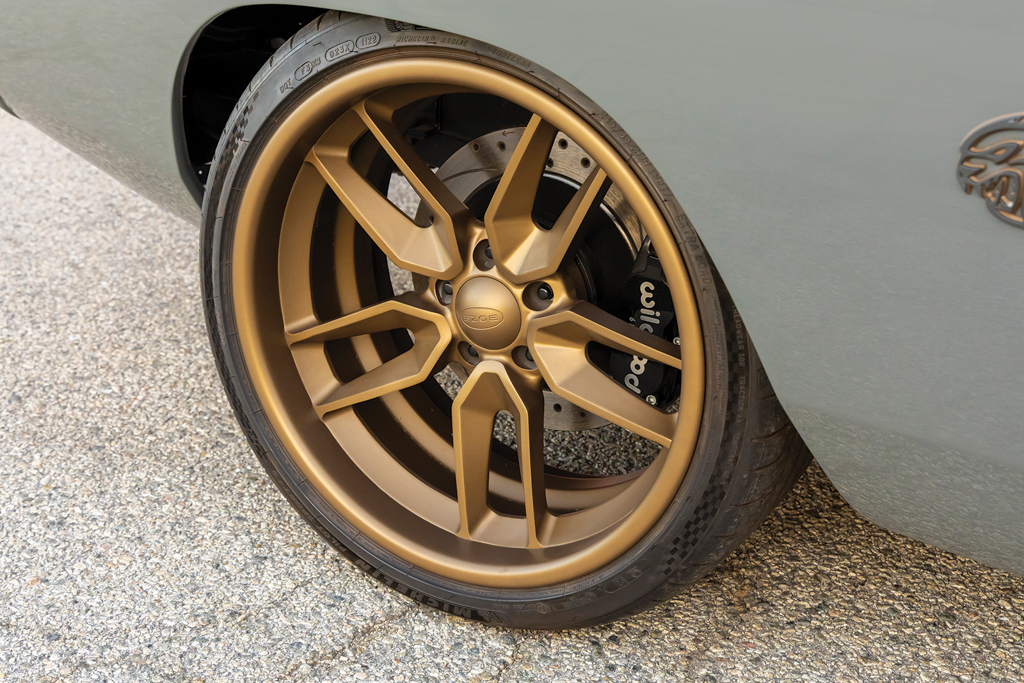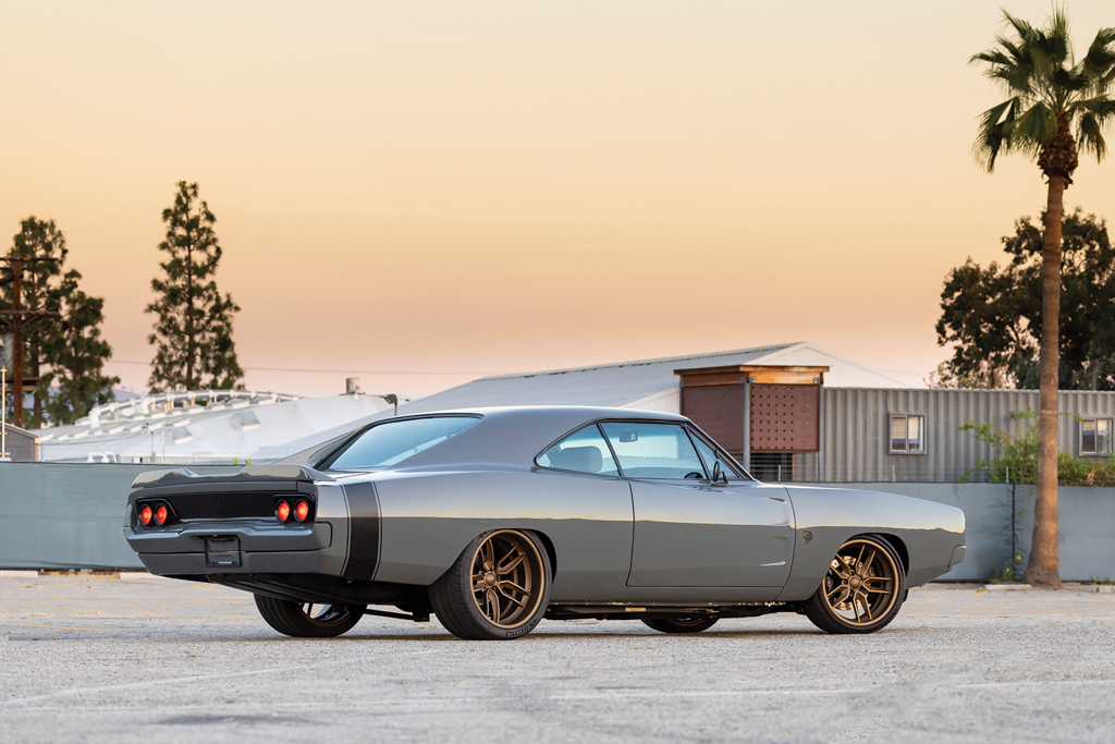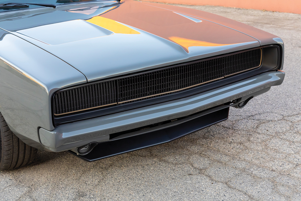 The Hollywood Hot Rods crew knew what was needed to make this a modern Pro Touring ground pounder and, at the same time, feature amazing looks. In front, the grille opening was reshaped while the front bumper was redesigned and then cut and tucked to give a snug and flowing fit to the front. The rear bumper was also cut and tucked, cleaning up the rear lines. Additional reshaping can be seen in the front and rear valance as well as the rear panel. Also, in the back, the wheel well was re-radiused, the corners were reshaped, and the rear fender caps were removed. The Dodge Charger did receive a “haircut” with the removal of the side marker lights (mandated in 1968 for all cars), factory identity emblems, and door handles. The Charger received a rear wing that was made from components from a modern Charger rear wing. Receiving the nod for the abundant amounts of bodywork fell to California Autoworx, and from there they painted the Charger in Chrysler Destroyer Gray with black vinyl factory-style trunk wraparound stripes. (An interesting backstory on the paint. The Destroyer Gray was introduced in 2017 for Chrysler’s performance cars. Some would say that it is devoid of color and it has no metal flake in it. It was discontinued in 2019, thus making it a very limited production color.)