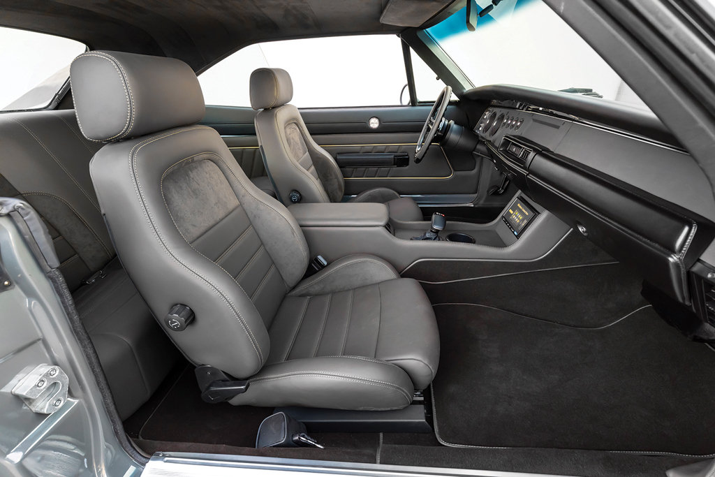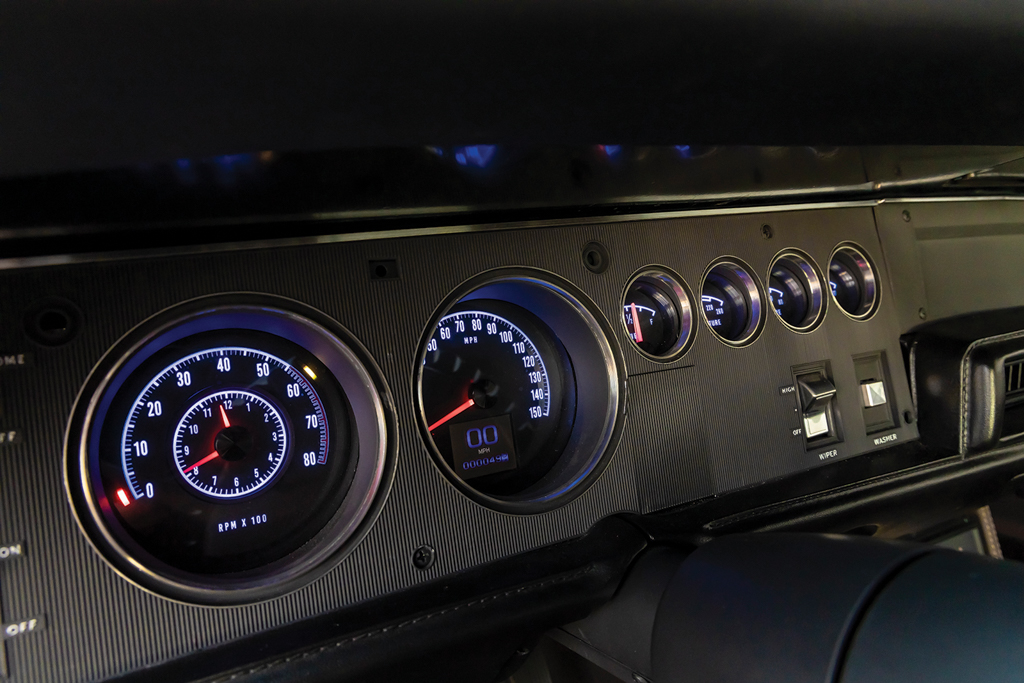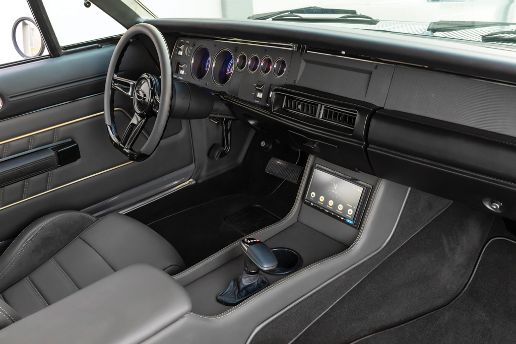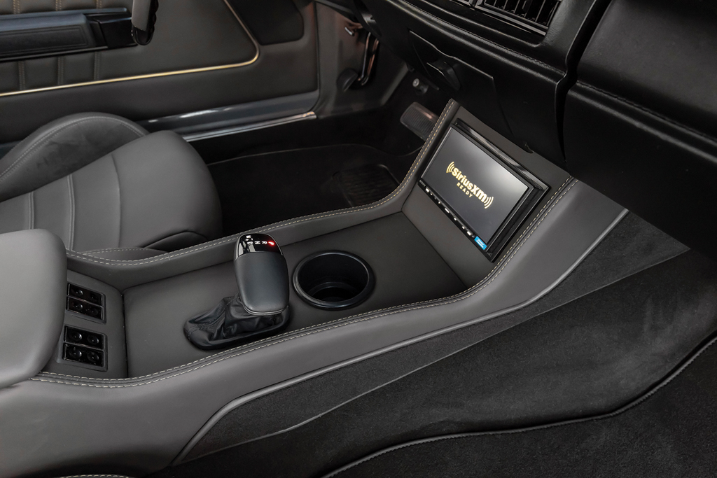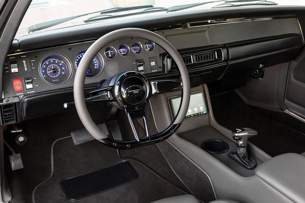 The stock dashboard is retained inside, but it is now leather covered. The modern instrumentation from Dakota Digital, coupled with an American Autowire wiring kit positioned by Hollywood Hot Rods, brings the entire package to life. A factory steering column is retained and topped with a Billet Specialties steering wheel. Other appointments include Vintage Air heating and air conditioning along with a modern-day Charger transmission shifter in the custom center console and a Sony touch-screen stereo system with a rear camera feature. The Sparco front bucket seats and rear bench seating are now covered in gray leather, with all the interior and trunk stitchwork appropriately handled by Mark Lopez of Elegance Auto Interiors. The headliner is suede and the carpeting is dark brown, again all by Elegance Auto Interiors.