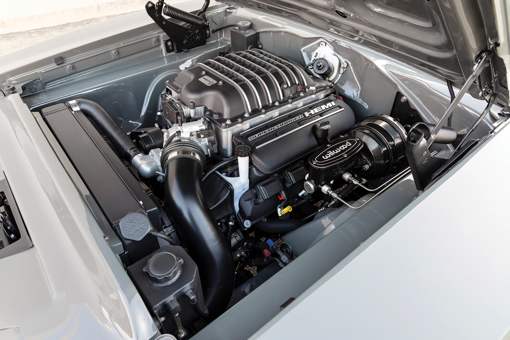 “What’s under the hood?” is typically the first question asked when walking the walkways of any car show or rambling the aisles at any Friday night burger joint gathering. Of course, today, the sophisticated hot rodder has his coffee and doughnuts with a healthy dose of high-octane gas fumes, the crackling of a potent V8 engine, and the early morning chill. No matter how good-looking a particular car may be, what’s under the hood justifies all the admiration. While we don’t know the owner (clearly the strong silent type) of this combination of “old and new,” we do know that Troy Ladd and his crew at Hollywood Hot Rods knew just what to do. The unnamed owner liked the modern Pro Touring appearance and had the idea of blending a 1968 Dodge Charger with the apex of the Charger’s modern drivetrains—the supercharged Hellcat V8 engine with all its 717 hp.