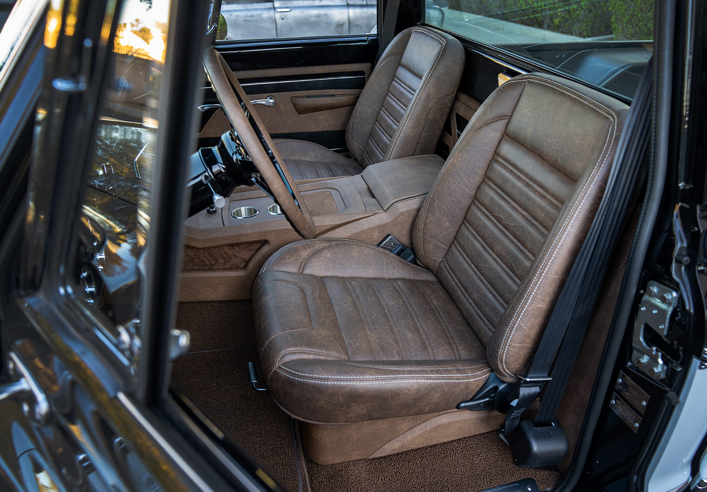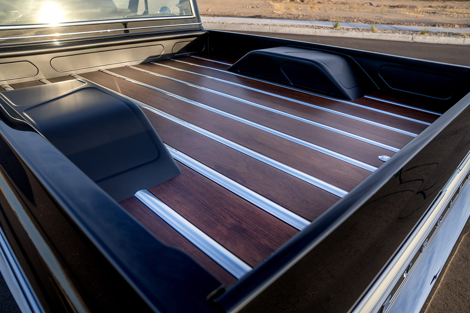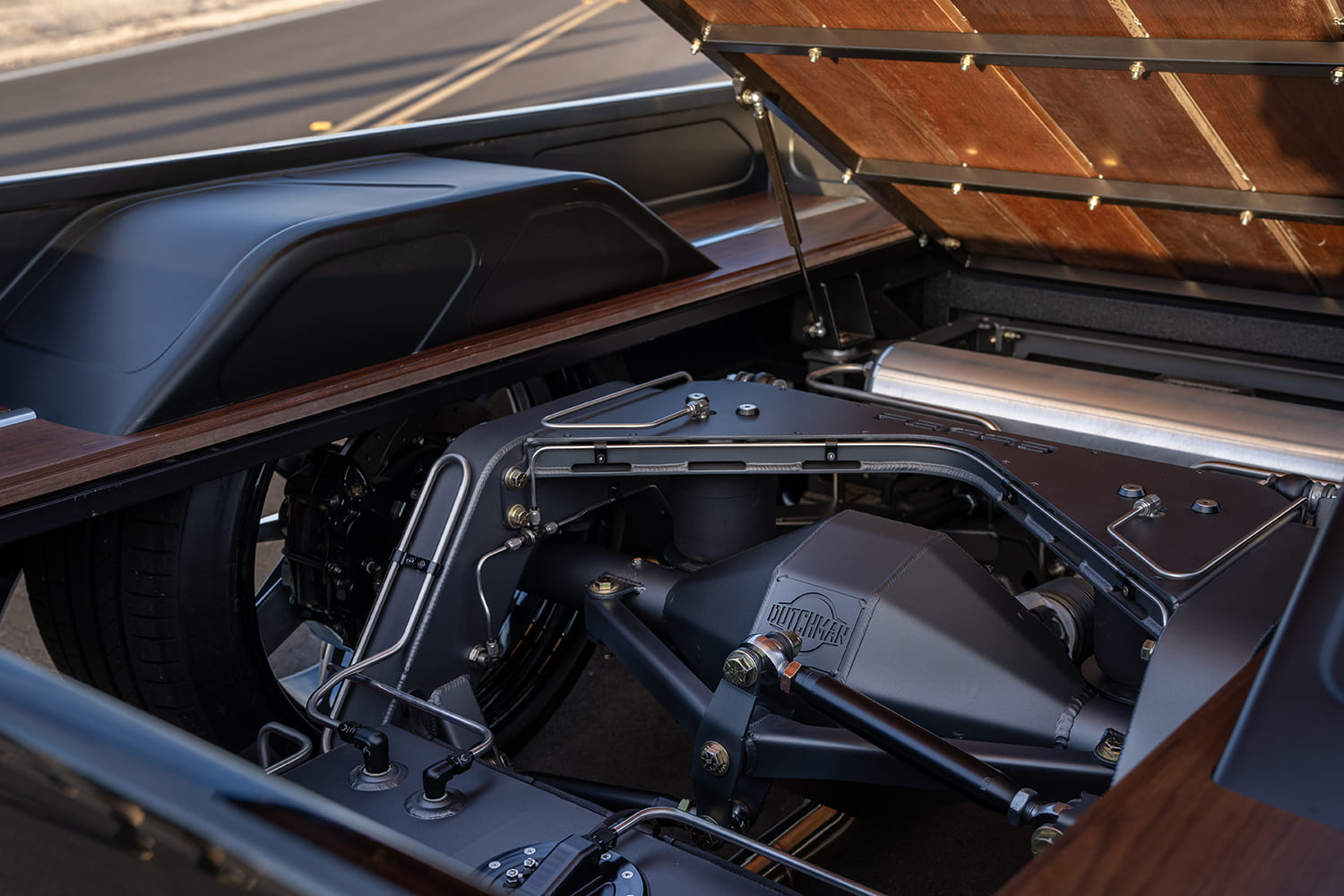 Beneath that Rob Drew/Mason Rush bodyworked and painted (with custom sheetmetal work by Will Bynum, metal polishing by Dee Frost/Strong Arm, and striping by Ron Hernandez), Peruvian Walnut bed-floored, and CST-trimmed C10, the owner-installed Level 3 kits are manipulated by an Air Lift Performance 3H ride height system that’s accompanied by a Flo Air supply setup, Ridetech shocks, CPP spindles, and 14-inch Wilwood brakes all ’round—with Arizona High Test’s trademark hardlines by Brian Lee! Between a set of Hart Fab inner fender panels lies the heart of the PRF10: a 376-cube, Whipple-supercharged LSX with full stainless exhaust by Andy Venable, backed by a Hughes Performance 4L80E feeding a Dutchman 9-inch rearend. The wheels chosen for the build are Budnik’s Tungsten in 22-inch-diameter sized up with Pirelli rubber. Finally, the inside of the ’69 features a perfect blend of TMI Products (buckets and dash top) and MTI Acoustics (headliner, door/kick panels, and center console) all covered in a saddle brown by Dominic Dominguez. Josh also enlisted MTI to handle the JL Audio sound system as well, while the Dakota Digital instruments and Vintage Air system were wired using an American Autowire harness by Chris Murray.