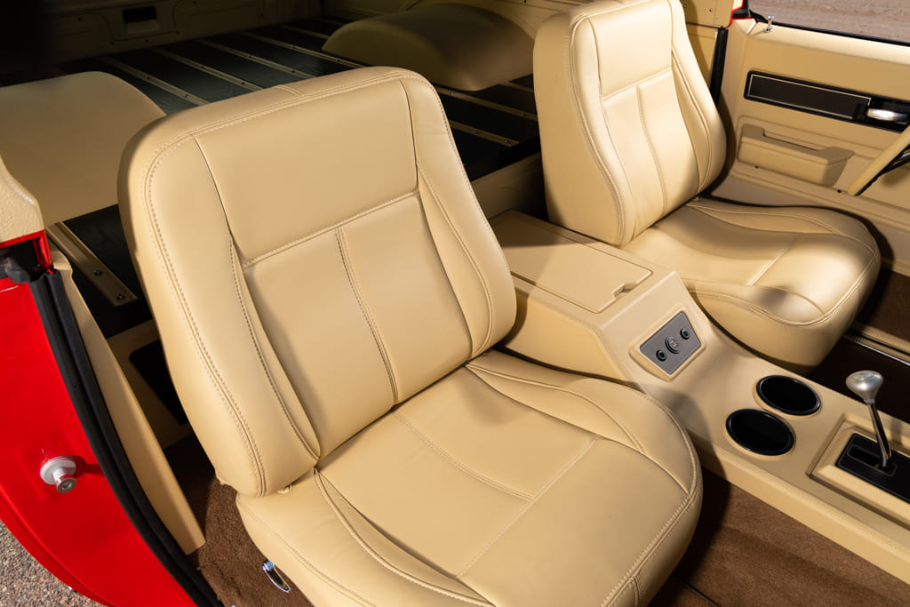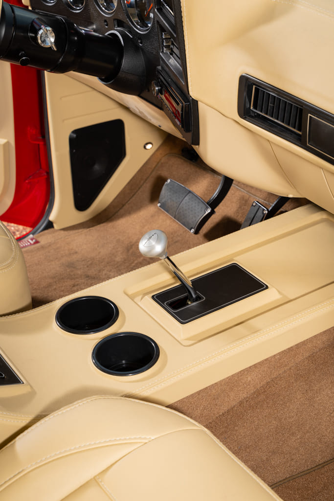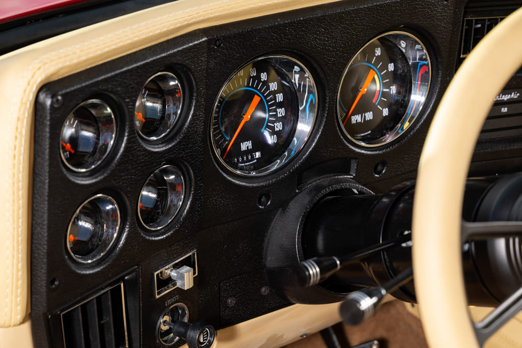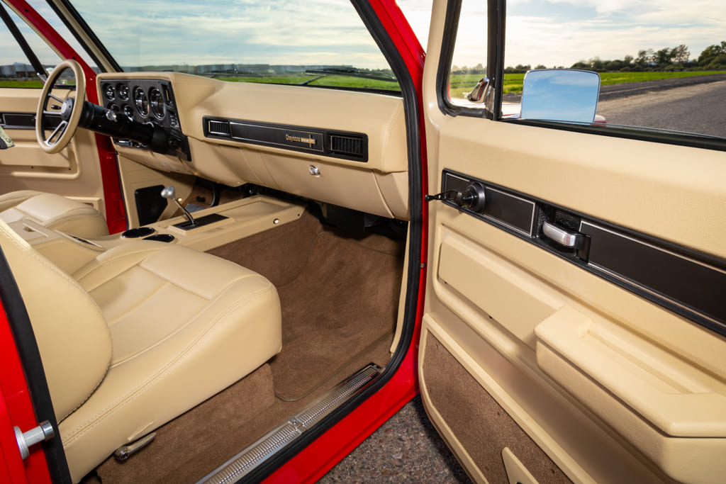 To bring the interior space up to speed, Mario’s Trim Shop was recruited to cover the Snowden 22-inch bucket seats in a custard-colored Ultraleather upholstery that also adorns the factory dash, the custom door panels and center console, as well as parts and pieces all throughout the cab. Classic Parts of America stepped again to provide a dash insert and “OE” direct-fit gauges, and Forever Sharp sent over a one-off covered steering wheel to round out the clean yet custom touches experienced from the driver seat.