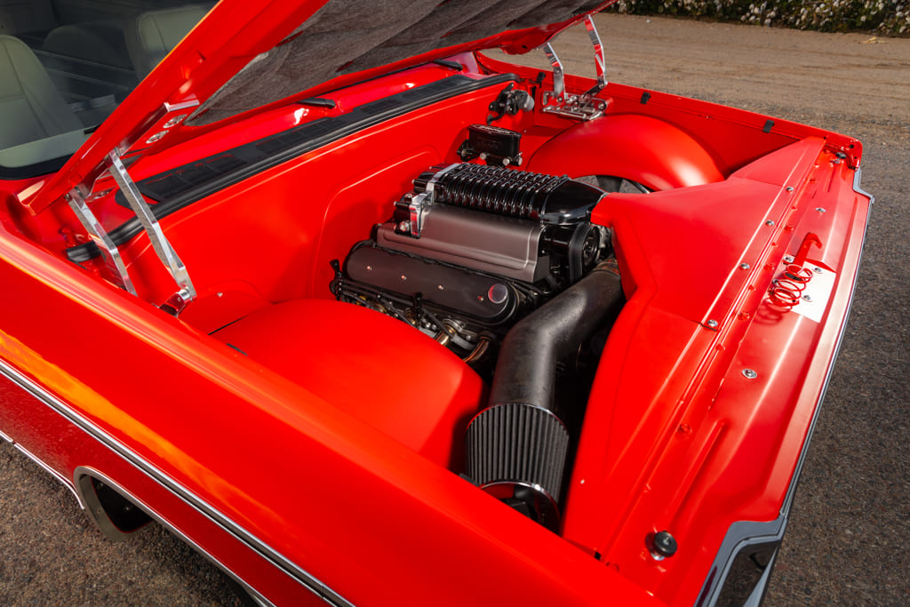Once the engine was well taken care of, the K5’s exterior was artistically handcrafted by Jason Hill and the rest of his crew. From shaving the firewall and fabricating bead rolled detailing within the engine compartment to the hidden fuel filler behind the taillight, the smoothed, complete top and the PPG Viper Red paint, the guys didn’t waste any time to start whipping the Blazer’s nearly 50-year-old body into winning condition. Slosh Tubz was contacted to provide their wheeltubs at both ends and Classic Parts of America was asked to deliver their OEM replacement headlights, taillights, outer mirrors, and door handles, as well as the front and rear bumpers that Hill’s then tightened and tucked for a cleaner appearance. Mar-K’s body side molding kit was utilized to restore some of the Blazer’s original styling cues, and when it came time to replace the OE glass, a Fesler flush-mount windshield kit and One Piece Products flush-mount side glass packages have been combined to create a smoother façade than ever before.