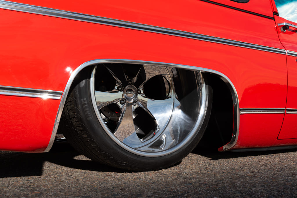 Jaime is a welder by trade, and he was just itching to put his expertise to work on his new K5 project. To start, he was looking to lower the height of the factory 2WD Blazer dramatically utilizing the stock frame, so he ordered a GSI Fabrication front air-ride and crossmember kit and figured out a custom back-half setup that he could easily assemble on his own. Next, Jaime collected Firestone ’bags and Monroe shocks for each corner, along with AccuAir air management components to bring it all together. Wilwood 14-inch front and 11-inch rear brake kits then replaced the factory components, and a set of killer Boyd Coddington 22×8.5 and 24×15 wheels wrapped in 255/35ZR22 and 405/25ZR24 Pirelli P Zero Nero tires were combined and bolted into place.