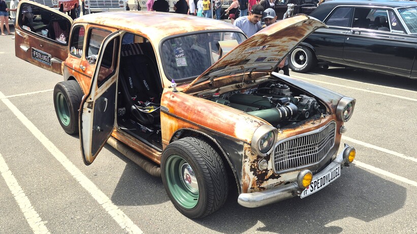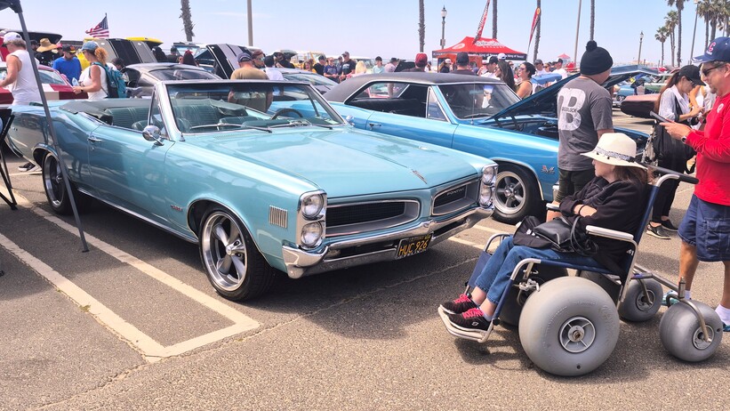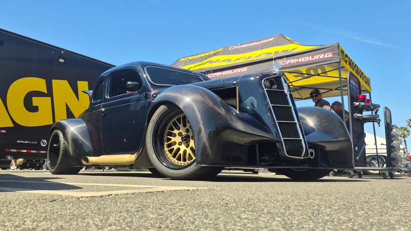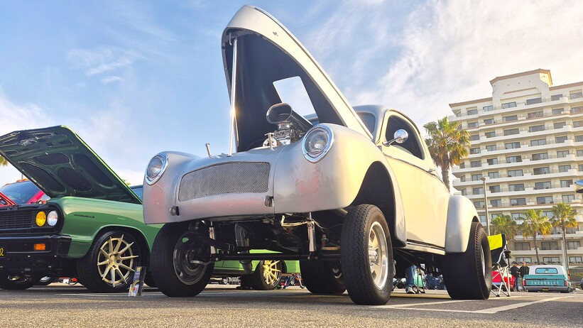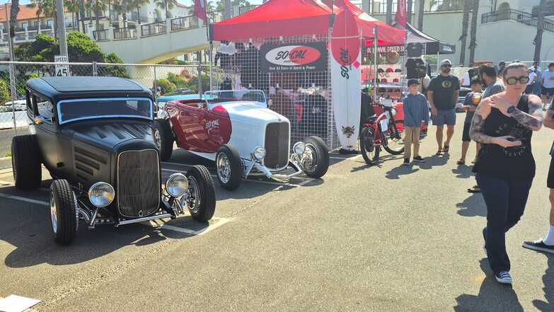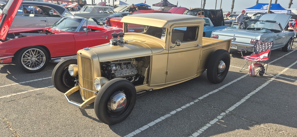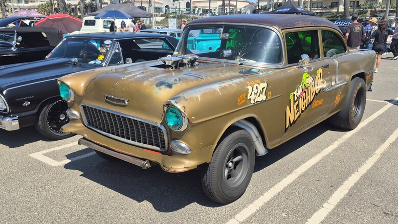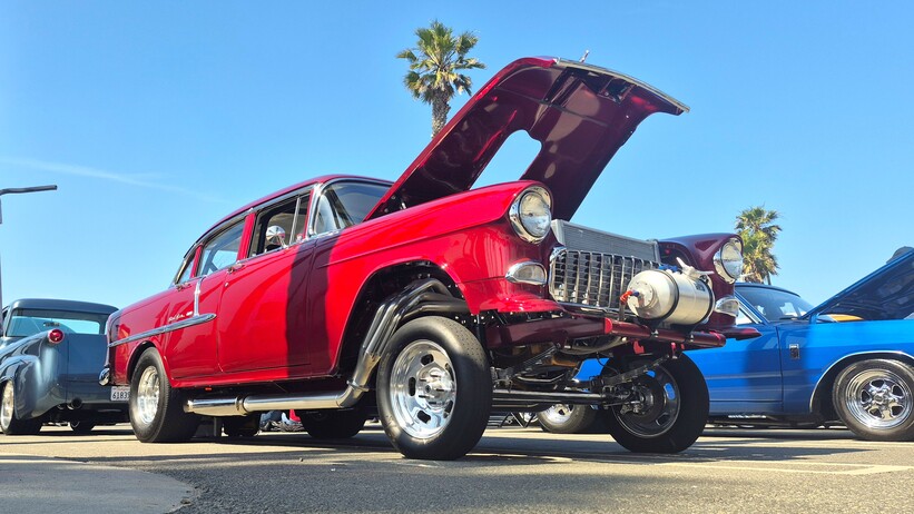 And that community showed up in force. Orange County and Huntington Beach brought out an eclectic, borderline-unbelievable mix of machinery: an unrestored, running 1920 Ford Model T still wearing oil-burning headlamps; a space‑age 1963 Chrysler Imperial that looked ready to roll into a Jetsons cartoon; a factory‑equipped, 32‑gallon tank 1977 Holden Torana; a four‑door big‑block 1955 Chevy gasser; an LS‑powered 1959 Fiat that behaved like a hooligan even at idle; Don Hampton’s classic Hemi slingshot dragster; and a carbon‑fiber, Viper V-10–powered 1935 Plymouth that stopped people mid stride. Tri‑Five Chevys stretched across the lot. Trucks sat either sky high or slammed to the pavement. Muscle cars filled every gap in-between. It was the full spectrum of SoCal hot rodding—raw, polished, weird, historic, overbuilt, understated, and always personal—set against the backdrop of a beach town that knows how to host a crowd. Hotrods N’ Heroes didn’t just gather great cars, it captured the spirit of a region where mechanical creativity and community pride run side by side. MR