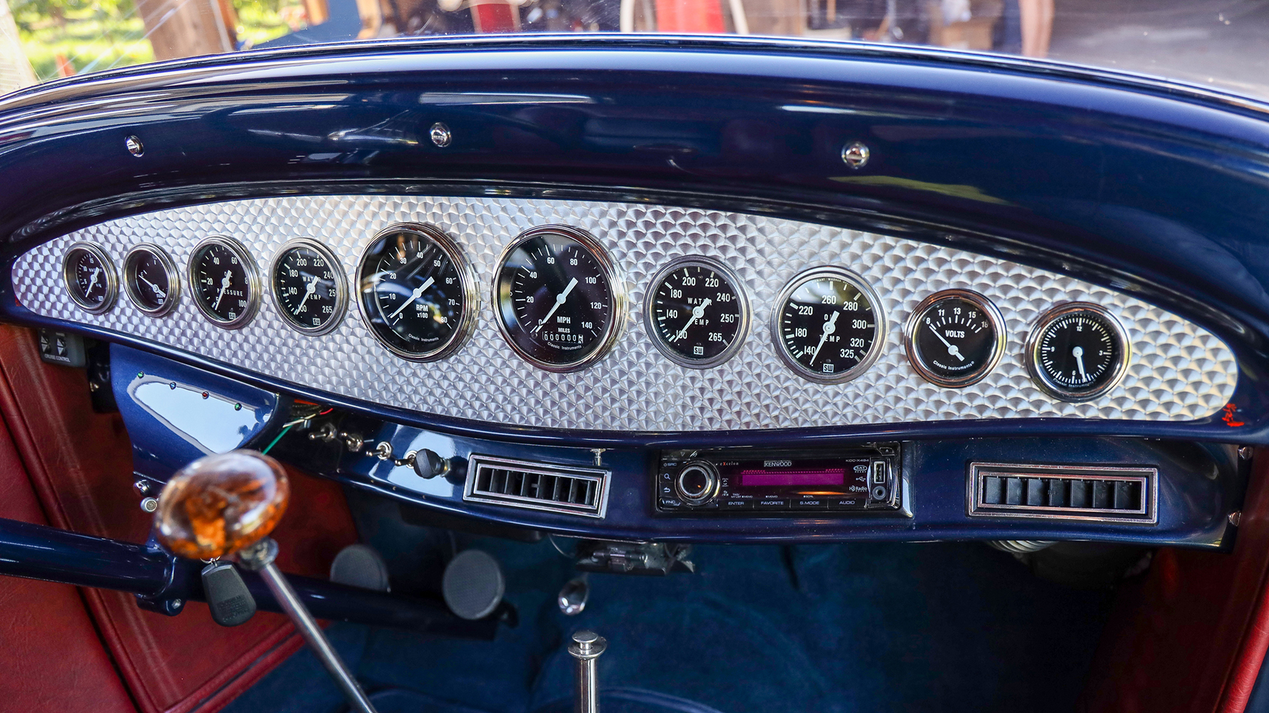 The electrical system’s complexity was my next puzzle to solve. An original 1932 locking ignition switch added a nostalgic touch, while the Centech panel and relays brought the car into the 21st century. With the clever placement of components in hidden spaces, Mike achieved a clean aesthetic without sacrificing function. The lighting—Sylvania performance headlights housed in nostalgic King Bee buckets—paired beautifully with Harley-Davidson “Tombstone” taillights.