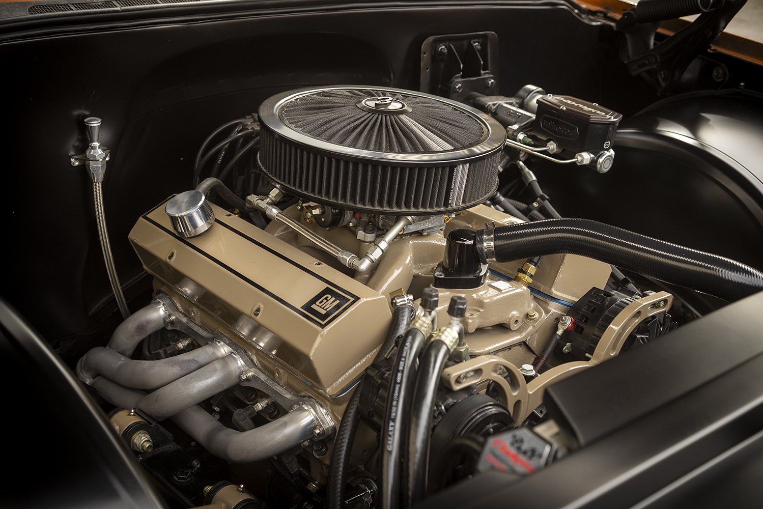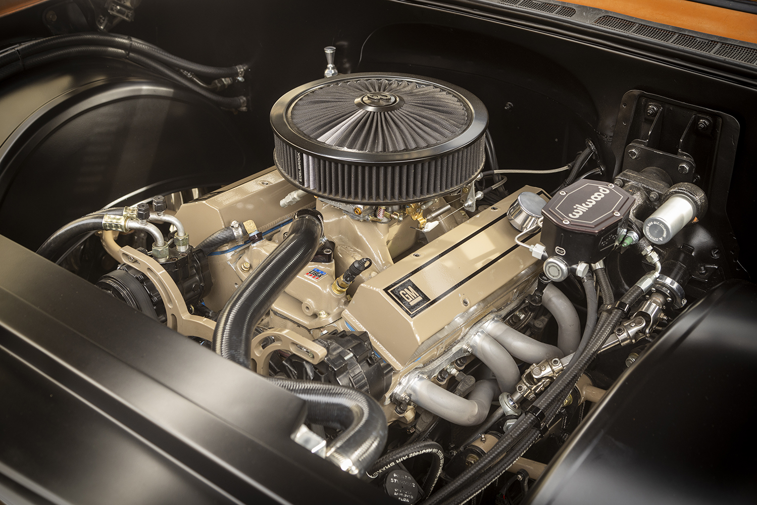 Beneath that OE patina is pretty much everything BUT OE: For starters, the frame has been front- and back-halved with Chopping Block suspensions, both controlled by AccuAir e-Level ride height management. A quartet of 14-inch Wilwood Aero disc brakes now mount 22-inch Raceline Billet Nitro wheels wrapped in Toyo Proxes. Beneath the hood—and now surrounded by Hart Fab sheetmetal inner fenders—is a rather lumpy 383 stroker SBC backed by a 700-R4 overdrive. Inside that one-year-only cab, Jason utilized a Snowden custom bench seat and replacement upper door panels.