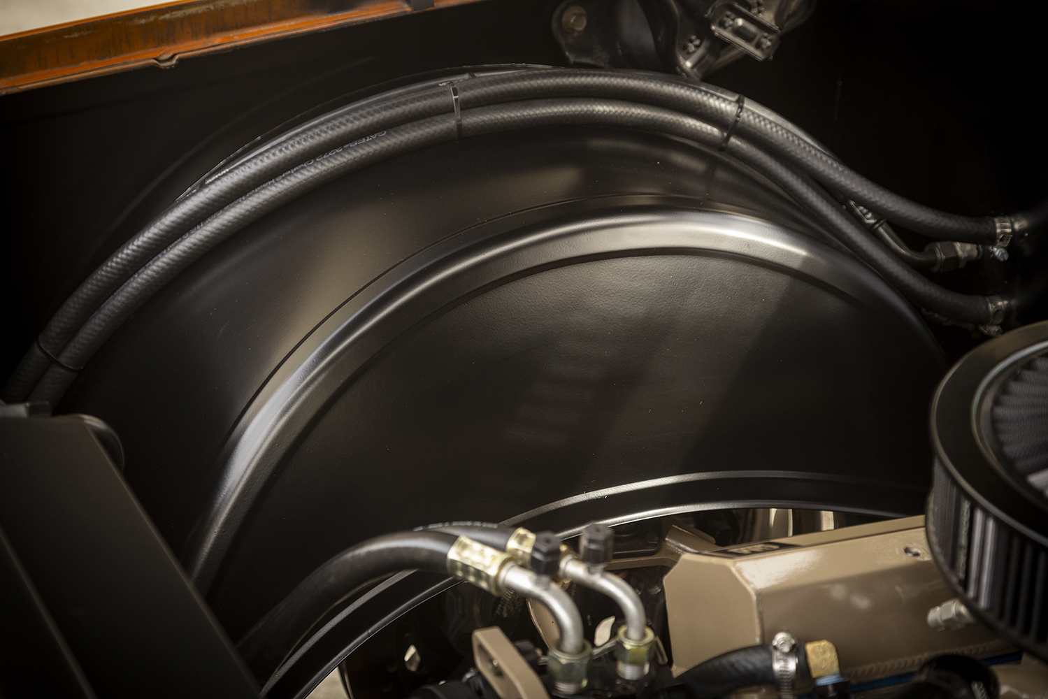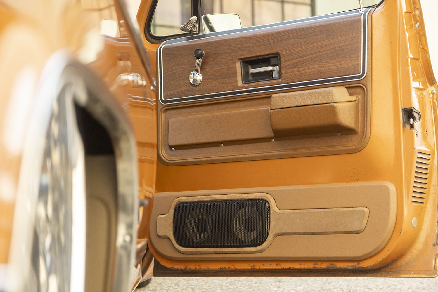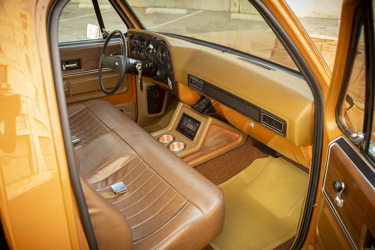 Though original, the gauge bezel now complements Dakota Digital’s VHX instruments, while a shortened Ididit/Squarebody Syndicate column does the same with the original steering wheel and the Vintage Air controls are discretely housed in the stock location. Audio Concepts wrapped up the interior, literally, with custom enclosures, lower door/kick panels, center console, and so on—all strategically and very tastefully housing a complement of JL Audio/Focal/Rockford Fosgate systems based off a Kenwood head unit producing a “modest” 1,800 watts with a mere 11 speakers!