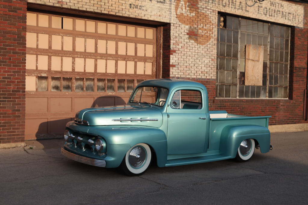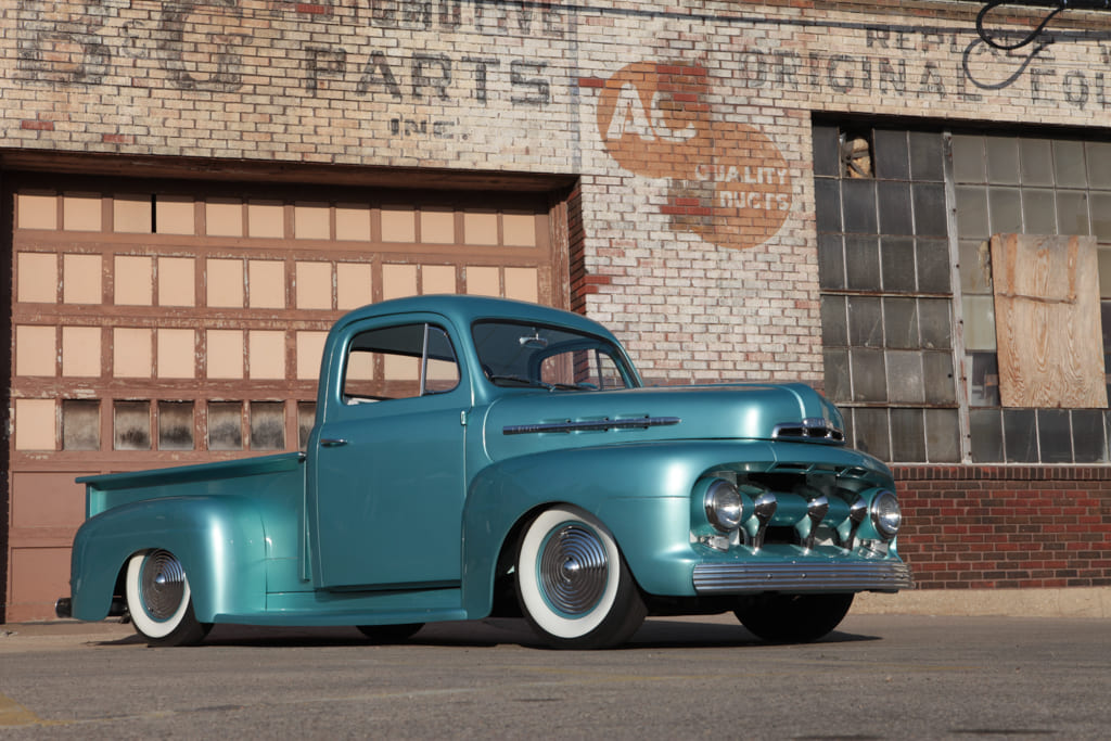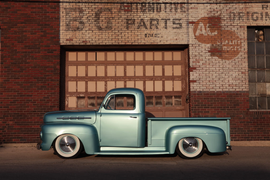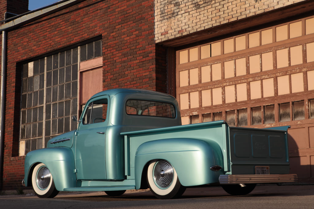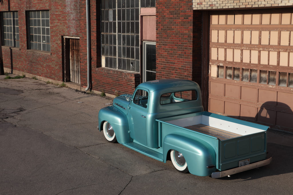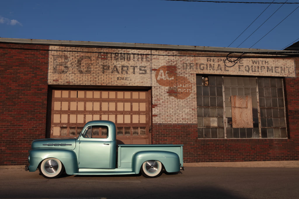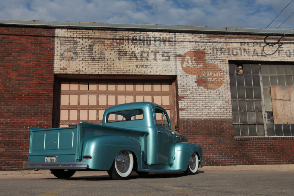 In our current world of social media, we are allowed to glance into the shops of builders from around the world. If you have a teenager in your life you may know how annoying this technology can be, but when harnessed properly it can be used to both motivate and inspire your own personal build. I kept tabs on the build of this ’51 F-1 by Jeff Jones of Monroe Center, Illinois, through social media. I was intrigued during the metal and bodywork phases, but when Jeff laid down the perfect tone of blue on the Ford’s massaged body I knew I had to see it in person. The ’51 made its debut at the Vintage Torque Fest show, one of the Midwest’s premier traditional hot rod events. As soon as I laid eyes on it, my camera trigger finger started twitching and I couldn’t wait for the photoshoot, utilizing downtown Dubuque, Iowa, as the perfect backdrop.