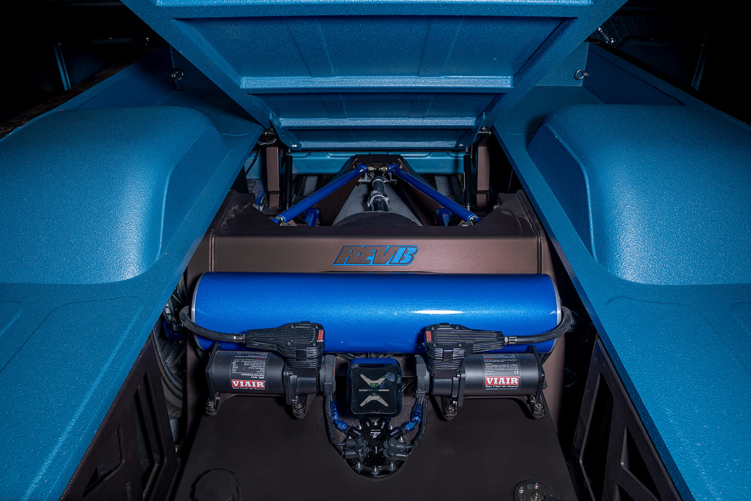“Once the chassis arrived, we really got into the build. The drivetrain bolted in perfectly and then the cab was lined up to make sure the drivetrain, chassis, and cab mounts were all in the right location in real life … not just on the computer. Once everything was positioned on the chassis, we got to work installing the Hart Fab inner fenders and plumbing the rest of the turbo setup around the engine bay. Originally, I was going to build the truck without A/C in it, but Mike at Restomod Air told me I was an idiot for that stupid idea and basically forced me to put one of his units in the truck. So the A/C condenser and lines were built around the Summit radiator and routed as simply as possible, with all the extra clearance issues from the big turbo underhood. After the engine bay was completed, we moved out back to the bed. The shortened bedsides were set in place over the chassis, and then we built all-new framework for the bed. Since this is the first chassis for REVB and the goal was to show it off. We built a simple sheetmetal bed with custom bead rolled sides and floor panels and a hatch that lifts up to show off the chassis. We always seem to have some extra parts laying around, and one of those parts was a set of hydraulic struts that are designed to stay extended. We came up with a way to hinge the bed floor while using those struts to hold the bed floor open. We then installed some cool looking latches I grabbed off of Amazon to hold it closed. It is totally different from how we normally build our bed floors and it worked out great!