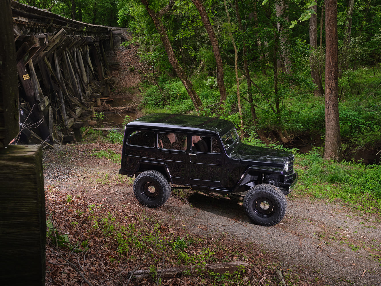 We were on Facebook Marketplace searching for a shop Jeep to take wheeling. While scrolling through the ads, my wife came across the Willys-Overland Wagon rusting away in a field. She had never seen one before and started researching them. We found that a lot of people were cutting them apart and turning them into “wheelers” or doing very classic restorations. We talked about how it could be cool if we did something different and combined both of those worlds and paid homage to what they were initially meant to do.