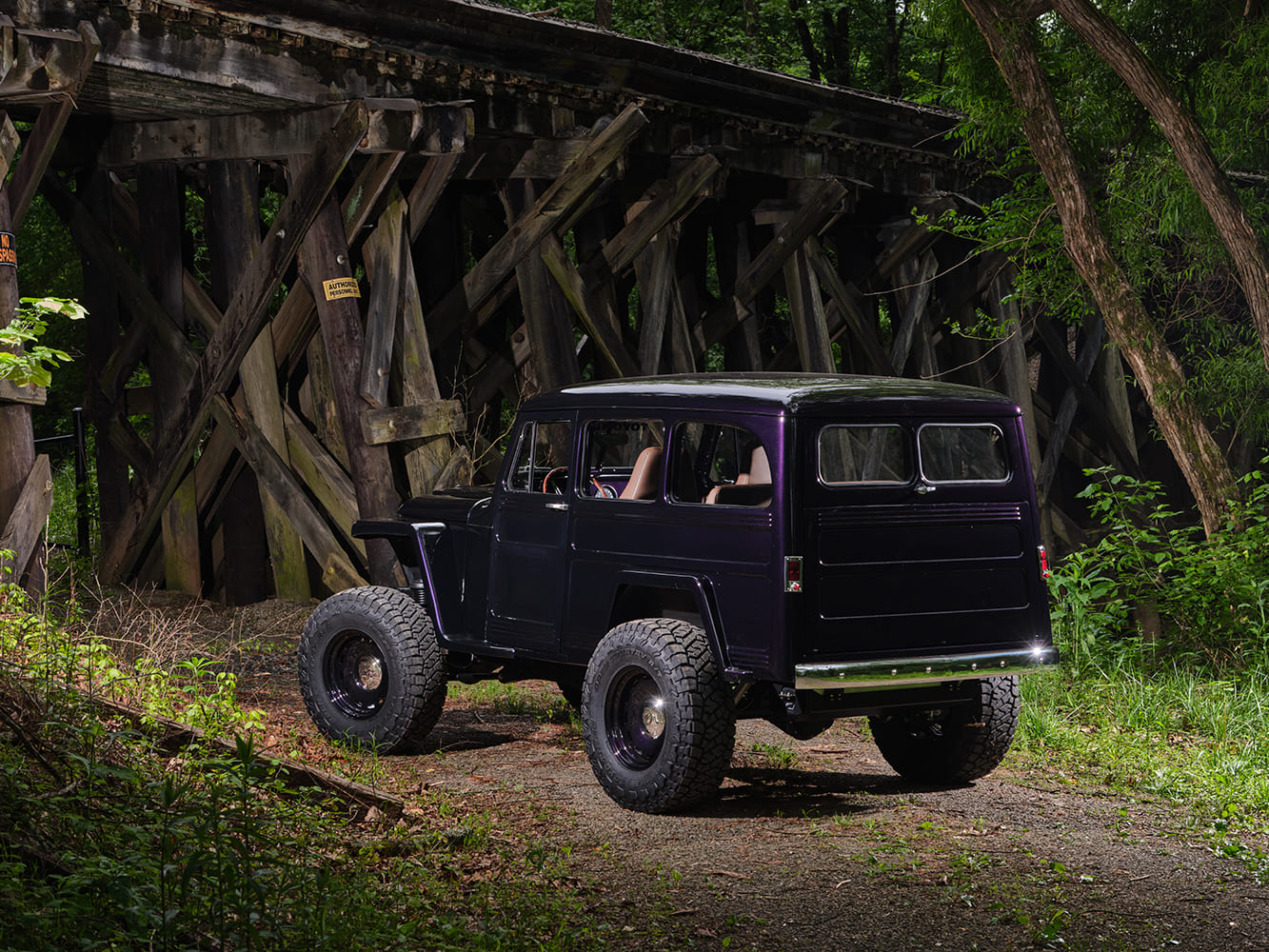 After reading various vintage advertisements we knew that we wanted the entire build to be centered around this duality of purpose: a smart family car with rugged capabilities but tweaks for modern times. Originally it was a 2WD vehicle, and on top of that someone had at some point changed the frame under the one we had to a C10 frame. We knew that it had to be 4WD and truly capable of off-roading. We made the suspension setup in-house and it sits on a three-link front and triangulated four-link rear. We used Metal Cloak springs and Fox shocks to achieve 3-1/2 inches of lift to clear 37-inch tires. We wanted to be able to clear a large tire while keeping the body as low as possible. The suspension was set up so that roughly 70 percent of the travel is downward. This allowed us to keep the center of gravity low. Considering its shaped like a big box, this definitely helped with driveability at highway speeds. It’s powered by a cammed LQ9 6.0L LS motor and a built 4L80E. To keep from breaking axles, it sits on an East Coast Gear Supply–built Dana 44 front and a Dana 60 rear with 4.88 gear and an E-locker front and Truetrac rear. It has the power and suspension to go anywhere you’d want to take it.