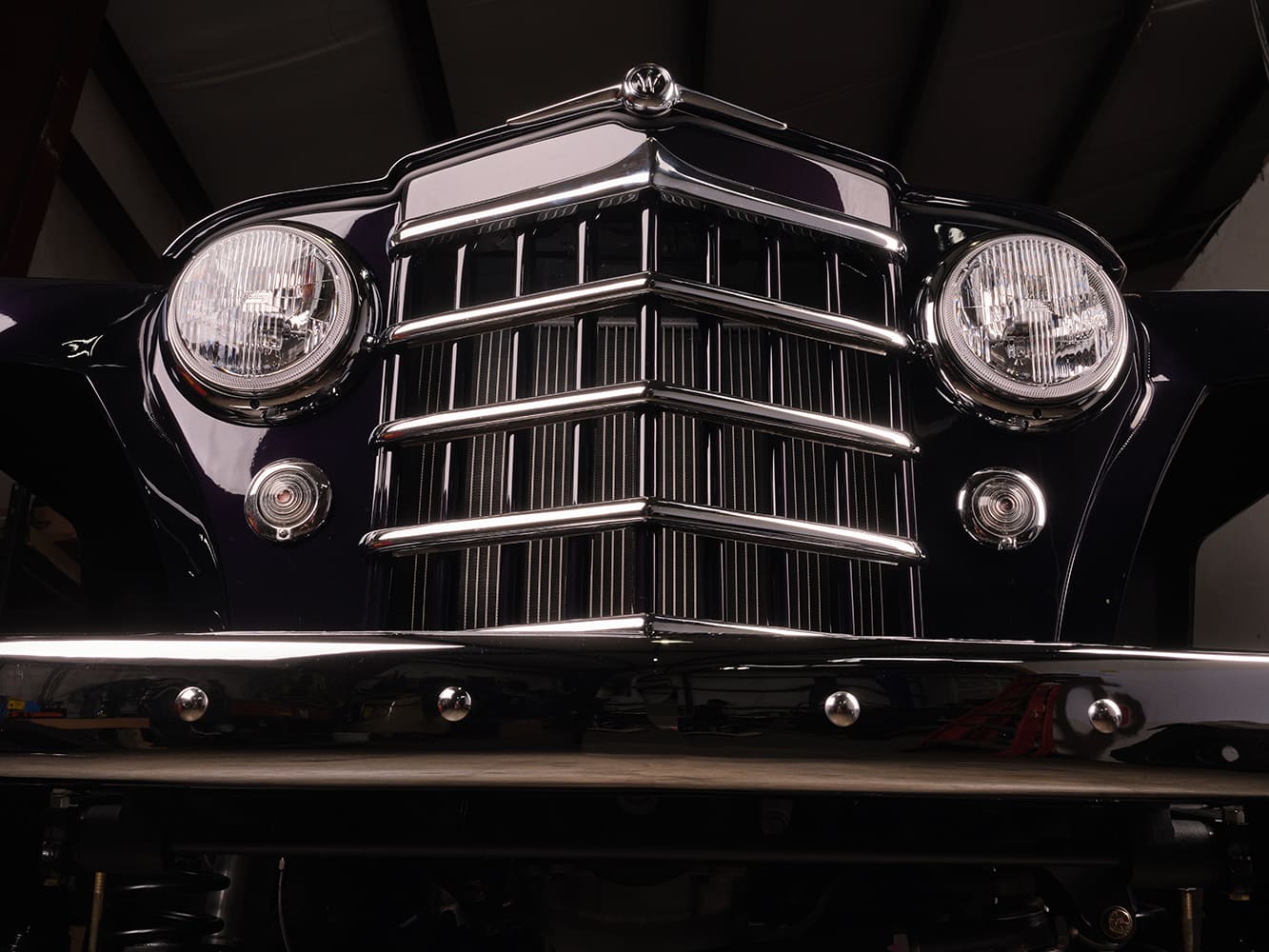 We really loved the exterior chrome pieces that were originally on the vehicle so we kept all of those and then reshaped the front and rear bumper. The rear bumper used to wrap around the sides of the vehicle and we chose to shorten it so it didn’t extend past the rear corners. The front end styling is what always stands out to everyone on the wagon so we knew that putting some sort of aftermarket bumper would ruin that. So, we took a replacement bumper and shortened it and had it chromed. This way it kept the classic sort of styling but also blends in more of a stubby off-road style bumper. Holley RetroBrights came in clutch so that we had modern lighting while sticking with the old-school look.