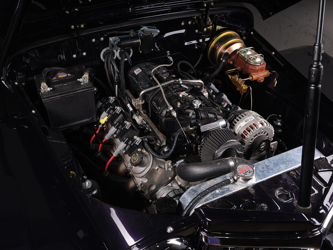 Overall, the main goal was to create something new and fun while paying homage to the vehicle. Something that a younger generation would love and something a purist would still appreciate. Thanks to the Hardline Customs crew, Jed Laborte and Dave Belzer; Tim Long at Dalton Automotive for the paint; Spencer at Top Stitch Interior for the upholstery; Andy Key and Jimmey Fowler at D and A Automotive for the engine work; Mark from Glass By Mark for all the flat glass; and Dan at Woodstock Muffler for the exhaust.